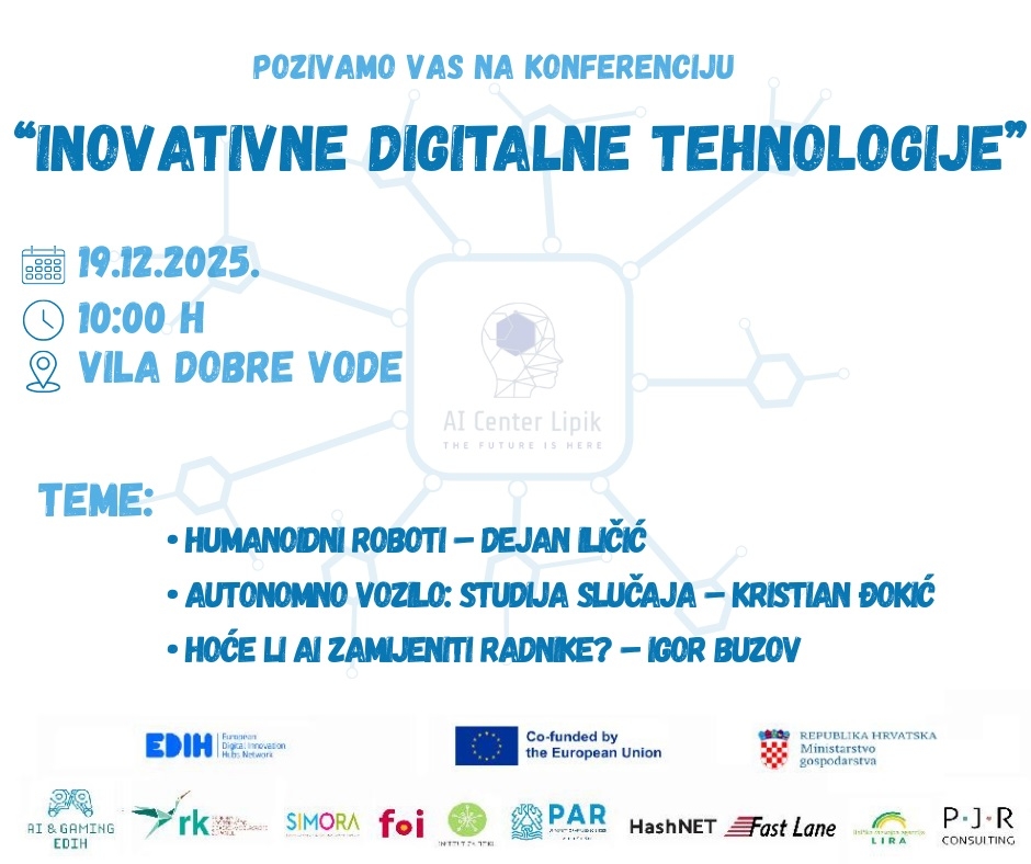 Centar umjetne inteligencije Lipik organizira konferenciju „Inovativne digitalne tehnologije”, koja će se održati u petak, 19. prosinca, s početkom u 10 sati u prostoru Vile Dobre vode. Konferencija je posvećena aktualnim temama iz područja umjetne inteligencije te njihovom utjecaju na tržište rada i poslovanje poduzetnika.