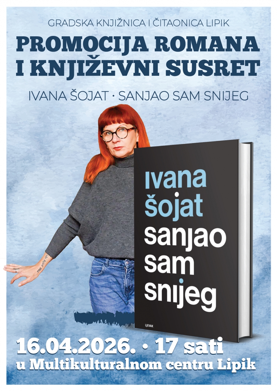 U prostoru Multikulturalnog centra, a u organzaciji Gradske knjižnice i čitaonice Lipik, u četvrtak, 16. travnja s početkom u 17 sati održat će se književni susret s jednom od najznačajnijih suvremenih hrvatskih autorica, Ivanom Šojat. Ovaj kulturni događaj donosi priliku publici da se izravno upozna s autoričinim radom, ali i promišljanjima o književnosti i temama koje obilježavaju njezino stvaralaštvo.