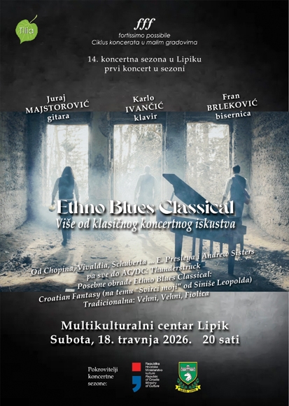 U Multikulturalnom centru u subotu, 18. travnja s početkom u 20 sati započinje 14. koncertna sezona u Lipiku, a otvorenje donosi poseban glazbeni doživljaj koji pomiče granice klasičnog koncerta. Prvi nastup u novoj sezoni pripast će triju Ethno Blues Classical.