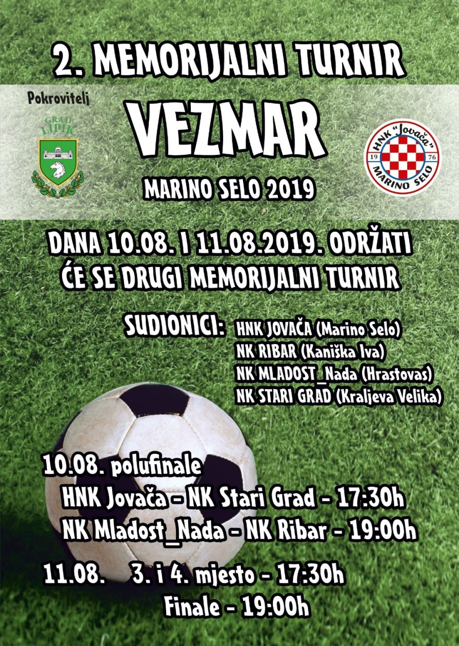 U organizaciji HNK „Jovača“ Marino Selo i pod pokroviteljstvom Grada Lipika 10. i 11. kolovoza na nogometnom igralištu u Marinom selu, održat će se Memorijalni turnir „VEZMAR“, posvećen poginulim igračima HNK „Jovača“ u Domovinskom ratu i tragično preminulima. Na turniru će uz domaćina HNK „Jovača“, nastupiti još NK „Ribar“ (Kaniška Iva), NK „Mladost_Nada“ (Hrastovac) i NK „Stari Grad“ (Kraljeva Velika).