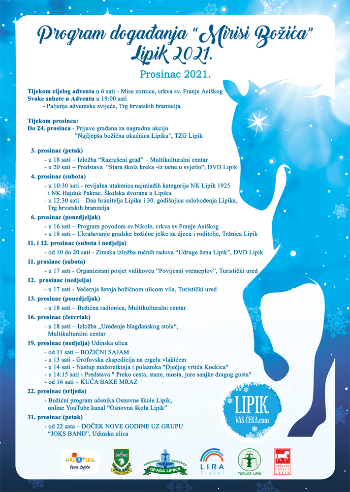 BOŽIĆNI SAJAM - 19. prosinca (nedjelja) od 11:00 sati započinje Božićni sajam na kojem će svatko moći pronaći nešto za sebe, a vjerujemo i za najmilije kroz bogatu ponudu brojnih OPG-a, kućnih radinosti, udruga i obrta s područja šire okolice. U sklopu sajma bit će upriličena i Grofovska ekspedicija vlakićem na ergelu, nastup lipičkih mažoretkinja, predstave za djecu te neizostavna KUĆA BAKE MRAZ! U njoj će posjetitelji moći posjetiti marljive vilenjake koji s Bakom Mraz danonoćno pripremaju sve za dolazak Djeda Mraza.