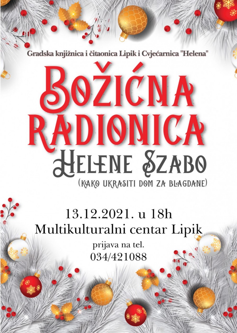 Kako biste lijepo i jedinstveno ukrasili svoj dom za blagdane u tome će Vam svakako pomoći i „Božićna radionica“ naše sugrađanke Helene Szabo tijekom koje ćete zasigurno naučiti neke nove ideje i koja će Vas inspirirati o tome kako da ukrasite svoj dom za blagdane.