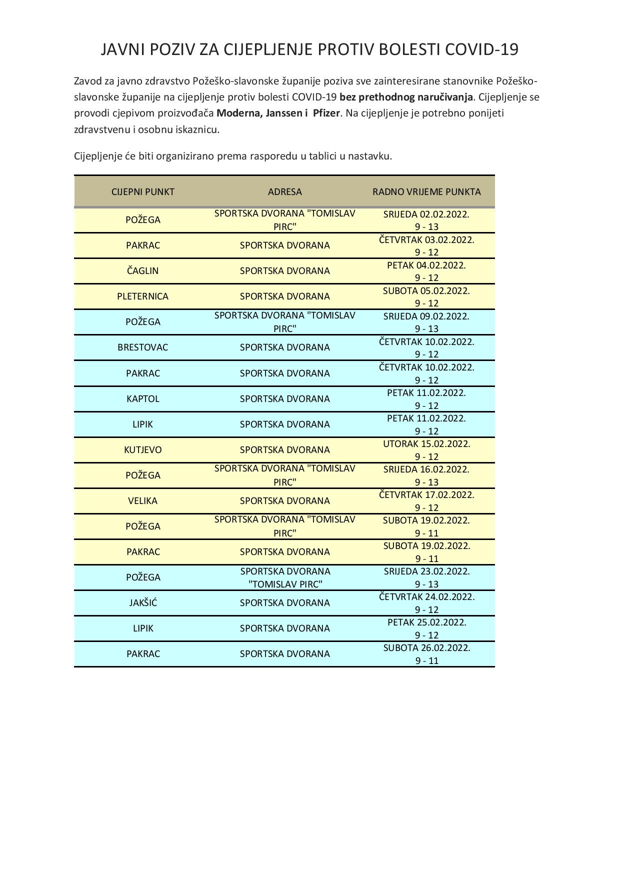 Zavod za javno zdravstvo Požeško-slavonske županije objavio je nove termine cijepljenja tijekom veljače. Tako će se zainteresirani građani s područja Lipika moći pristupiti cijepljenju prvog i trećeg petka mjesecu - 11. i 25. veljače u lipičkoj Školsko-sportskoj dvorani od 9 do 12 sati. U Pakracu će cijepljenje biti održano u Gradskoj sportskoj dvorani i to iduća dva četvrtka, 3. i 10. veljače te subotom, odnosno 19. i 26. veljače.