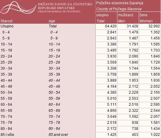 Na temelju ovih rezultata poznat nam je i broj stanovnika prema starosti i spolu na razini svih hrvatskih županija. Pojedinosti popisa za područje Požeško-slavonske županije te podatke o broju stanovnika prema starosti i spolu možete pogledati u nastavku.