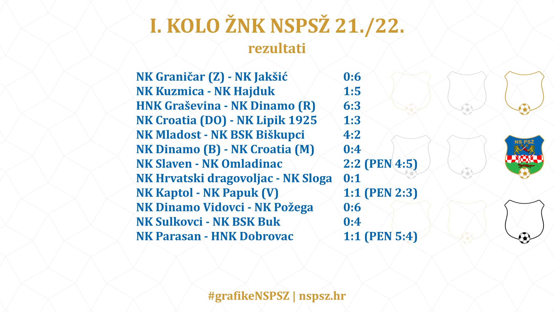 U sklopu prvog kola Županijskog nogometnog kupa (NSPSŽ 2021./2022.) koji se odigrao proteklog vikenda nogometaši NK Lipik 1925 slavili su s rezultatom 3:1 nad NK Croatia iz Donje Obriježi. Momčad NK Dobrovac je gostovala u Golobrdcima i pri tome je izgubila od tamošnje NK Parasan s 1:1 (pen 5:4). Osim Lipičana slavili su i nogometaši pakračkog Hajduka s 5:1 nad NK Kuzmica.
