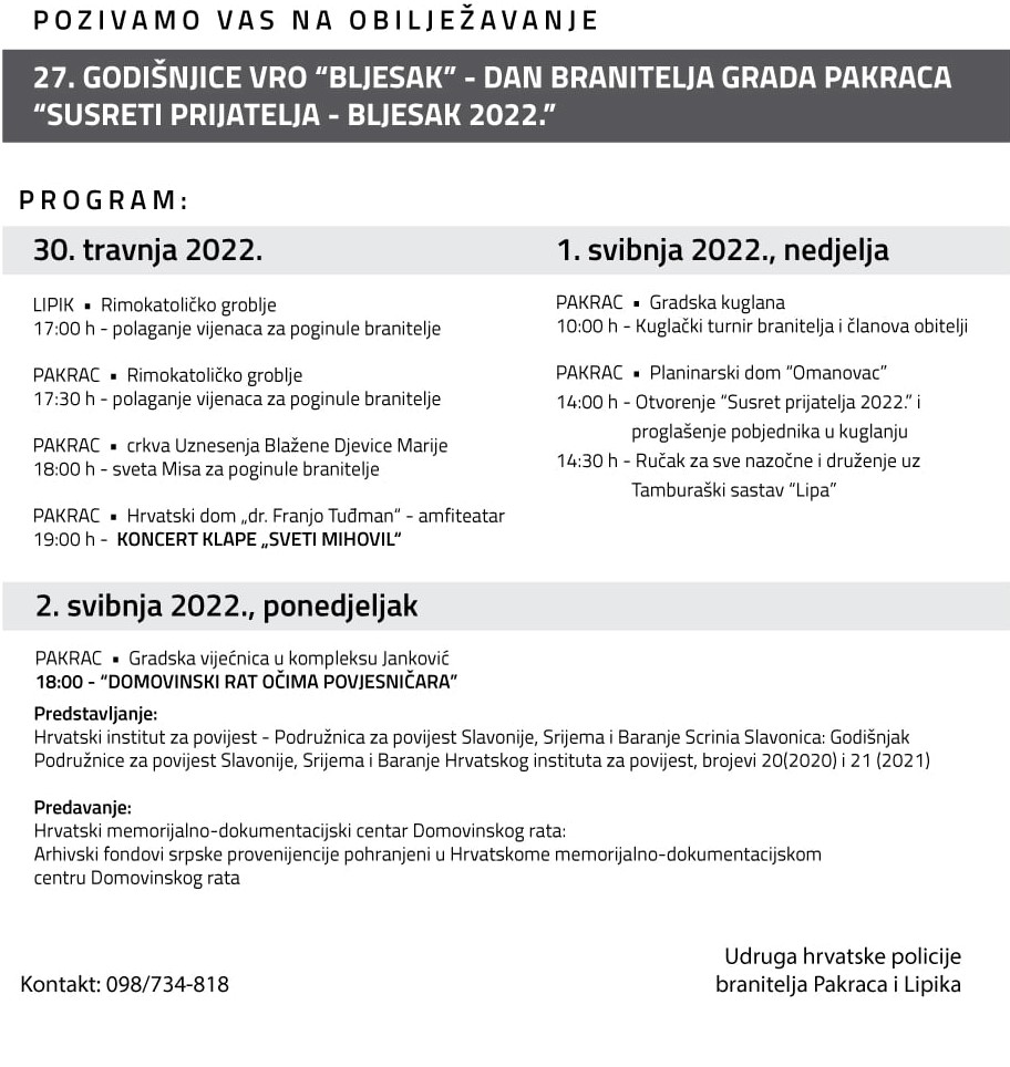Središnje događanje ovogodišnjeg obilježavanja 27. obljetnice VRO „Bljesak“ bit će „Susreti prijatelja – Bljesak 2022.“ kojeg organiziraju Udruga hrvatske policije branitelja Pakraca i Lipika i Grad Pakrac.