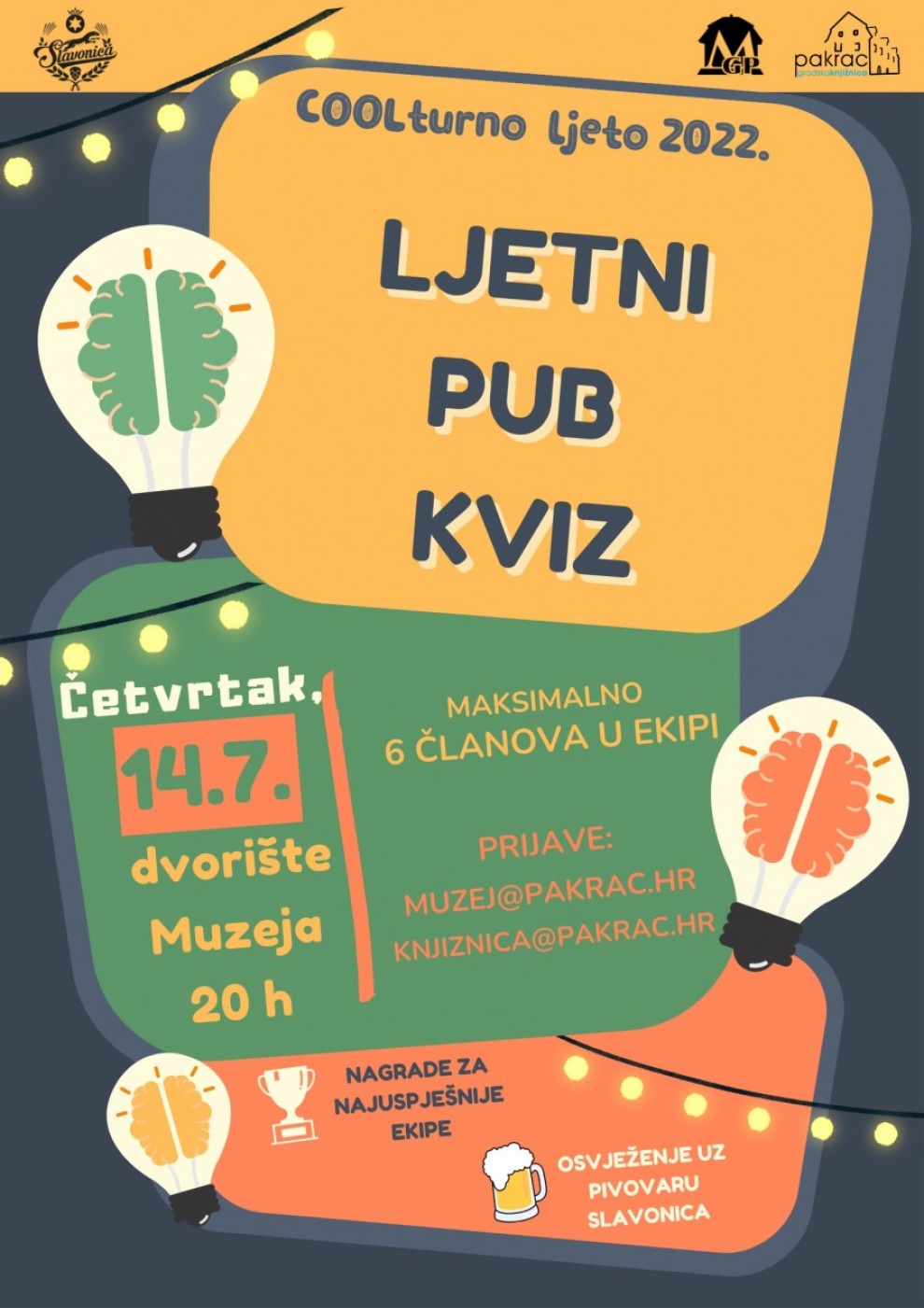 Današnji Ljetni pub kviz / COOLturno ljeto 2022., koji se trebao održati u dvprištu pakračkog kompleksa Janković je odgođen, doznajemo od ravnateljice Gradske knjižnice Pakrac Monike Lucić Fider.