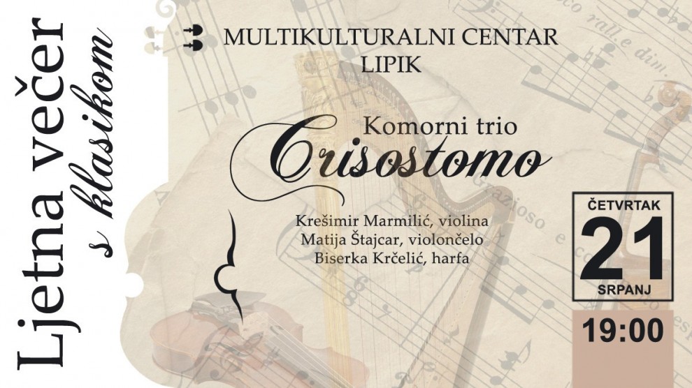 Udruga Tilia za promicanje kulture i kulturne baštine predstavlja vam pravu glazbenu avanturu uz Komorni trio Crisostomo koji donosi zvuk violine, violončela i harfe u grad glazbe.