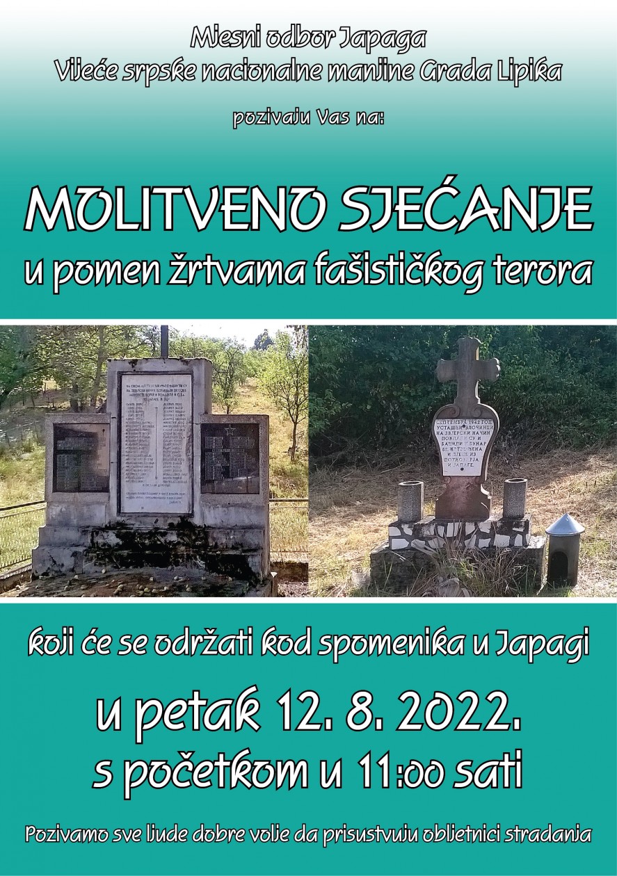 U organizaciji Mjesnog odbora Japaga i Vijeća srpske nacionalne manjine Grada Lipika, kod spomenika u selu Japaga u petak, 12. kolovoza s početkom u 11 sati, održat će se komemoracija u znak sjećanja na žrtve totalitarnog režima koje su stradale prije 80 godina.