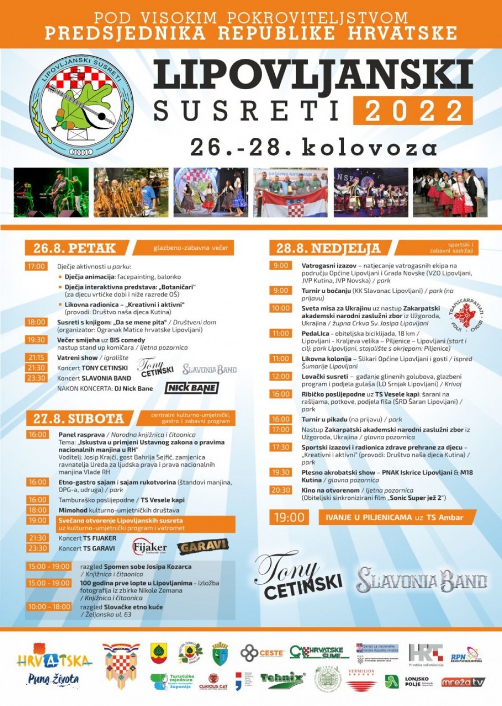 19:00 – Svečano otvorenje Lipovljanskih susreta uz kulturno-umjetnički program i vatromet