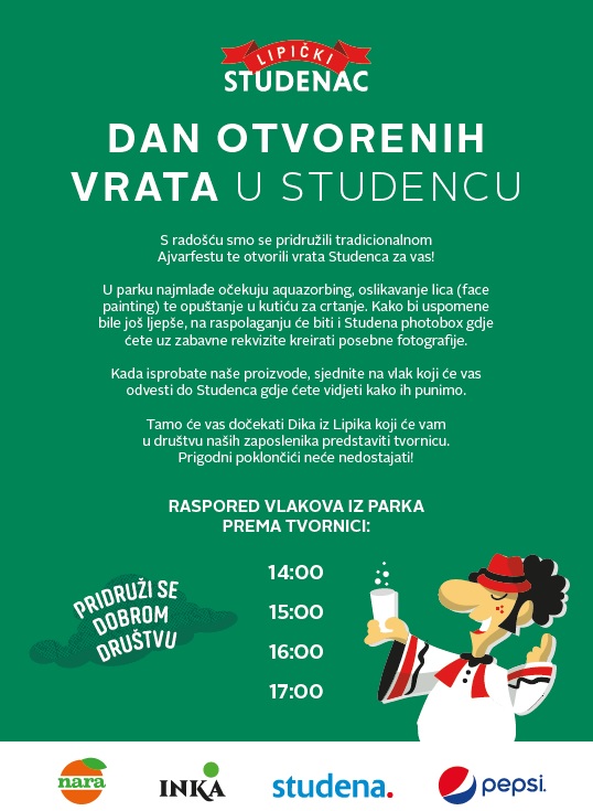 Ove godine se pridružuje i tvornica mineralne vode - lipički Studenac koji organizira "Dan otvorenih vrata u Studencu". Na svom štandu u parku, od 14 sati će predstavljati proizvode i aktivnosti, imati mnoga iznenađenja, veliki bazen za aquazorbing te facepainting. Posjetitelji Lipika će moći po prvi puta posjetiti tvornicu vode Studenac. Prijave su na štandu, a polazak je vlakićem svakih sat vremena. Mažoretkinje Grada Lipika će imati nastup i humanitarnu akciju prikupljanja sredstava za svoj rad i put na svjetsko prvenstvo. Dječji vrtić "Kockica" organizira dječju predstavu, kreativnu radionicu za najmlađe i maskotu. Tokom dana će biti zanimacija za djecu s napuhancima i raznim štandovima s igračkama, a svi posjetitelji će moći iskusiti jahanje na konjima KK Diamant, vožnju kočijom s lipicancima, te vožnju vlakićem.