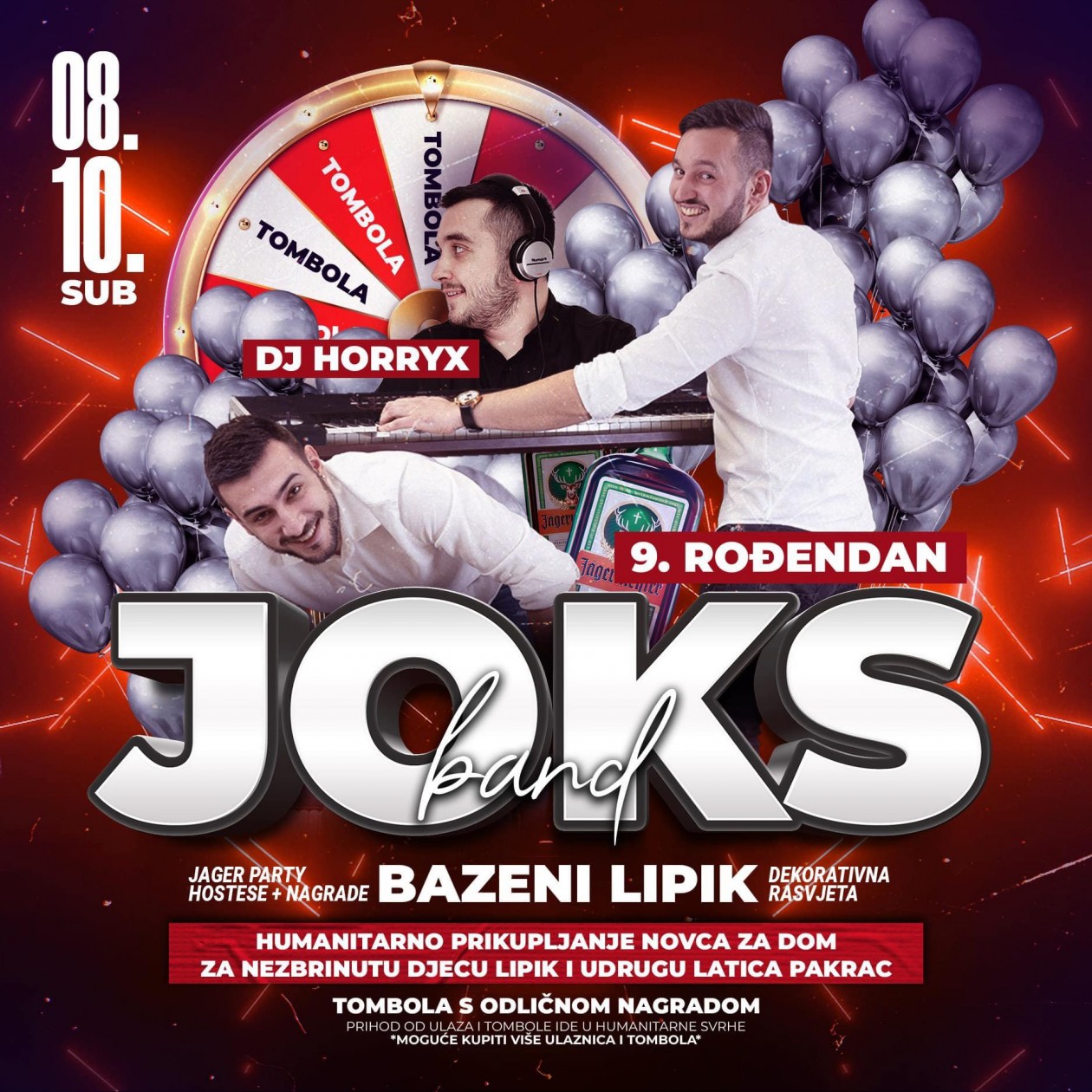 Proslava devetog rođendana popularnog JOKS BAND-a koja će se u subotu, 8. listopada održati na prostoru Bazena Lipik, ima i humanitarnu komponentu.