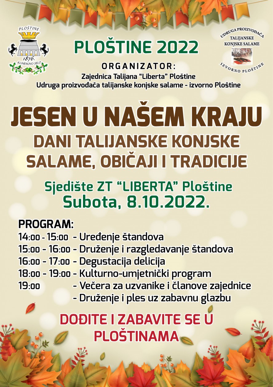 Tradicionalna manifestacija Zajednice Talijana Liberta „Jesen u našem kraju“ održat će se u subotu, 8. listopada tijekom poslijepodnevnih sati u Ploštinama.