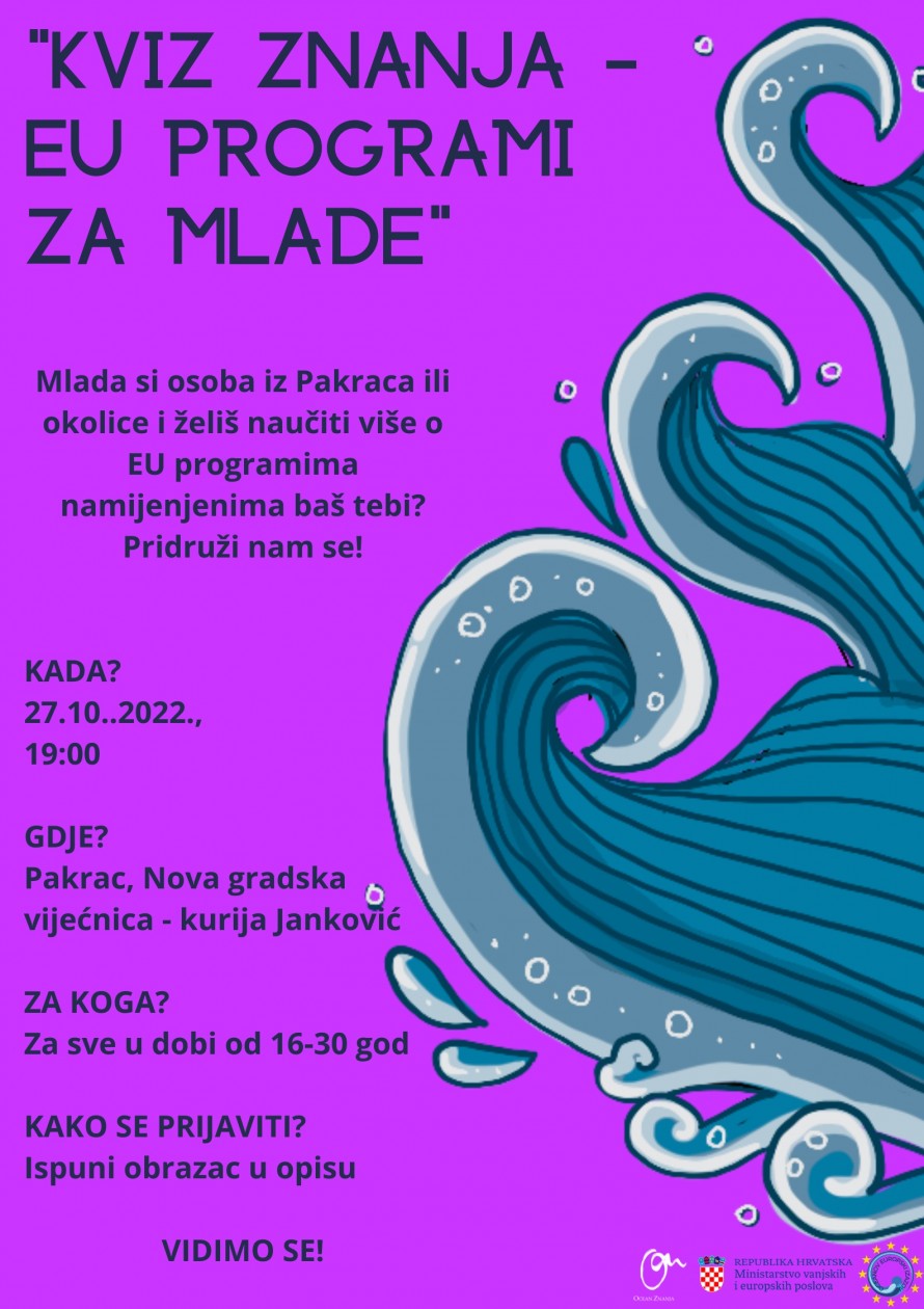 Projekt se sastoji od nekoliko aktivnosti u 4 grada (Pakracu, Požegi, Lipiku i Zagrebu), a u predstojećoj aktivnosti “Kviz znanja - EU programi za mlade” koja će se održati u četvrtak, 27.listopada od 19:00 do 21:00h u Novoj gradskoj vijećnici - kuriji Janković sudionici kviza moći će saznati zabavne informacije te ih očekuju zanimljive nagrade!