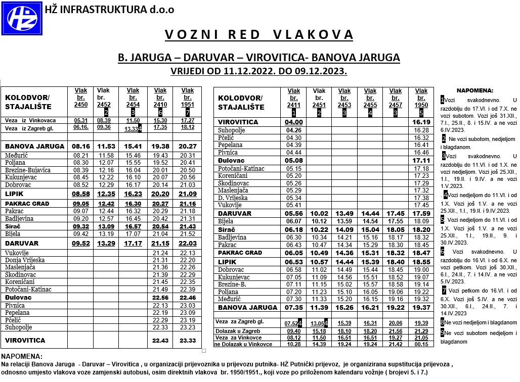U prilogu se nalazi novi vozni red Hrvatskih željeznica na relaciji Banova Jaruga - Lipik - Pakrac - Daruvar - Virovitica - Daruvar - Pakrac - Lipik - Banova Jaruga. Vozni red vrijedi od današnjeg dana, 11. prosinca pa sve do 9. prosinca iduće godine.