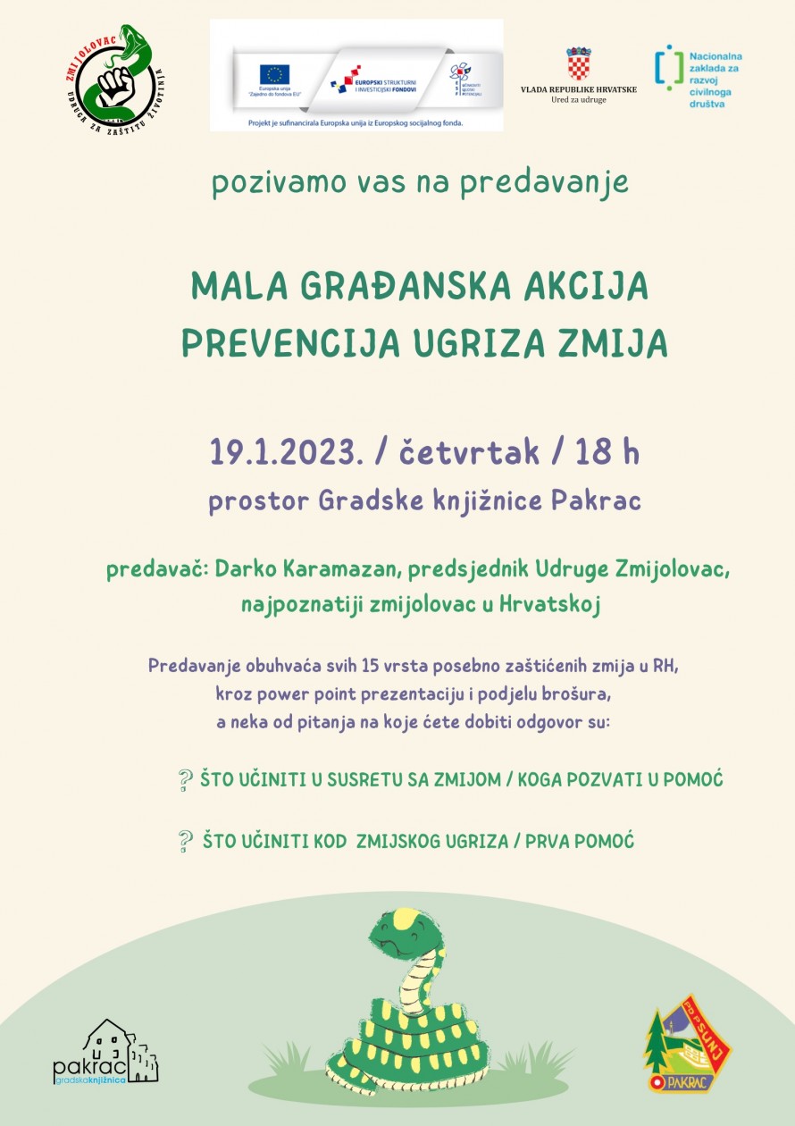 Predavanje pod nazivom Mala građanska akcija prevencija ugriza zmija održat će se u pakračkoj knjižnici u četvrtak, 19. siječnja – doznajemo od ravnateljice Monike Lucić Fider.
