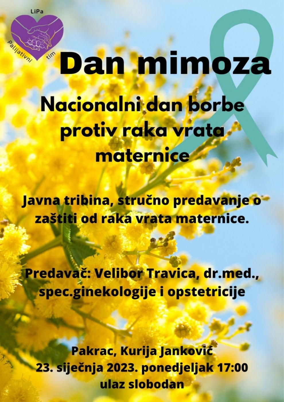 Javnozdravstvena tribina povodom Dana mimoza i Europskog tjedna prevencije raka vrata maternice održat će se 23. siječnja (ponedjeljak) u 17 sati u vijećnici smještenoj unutar kompleksa Janković u Pakracu.