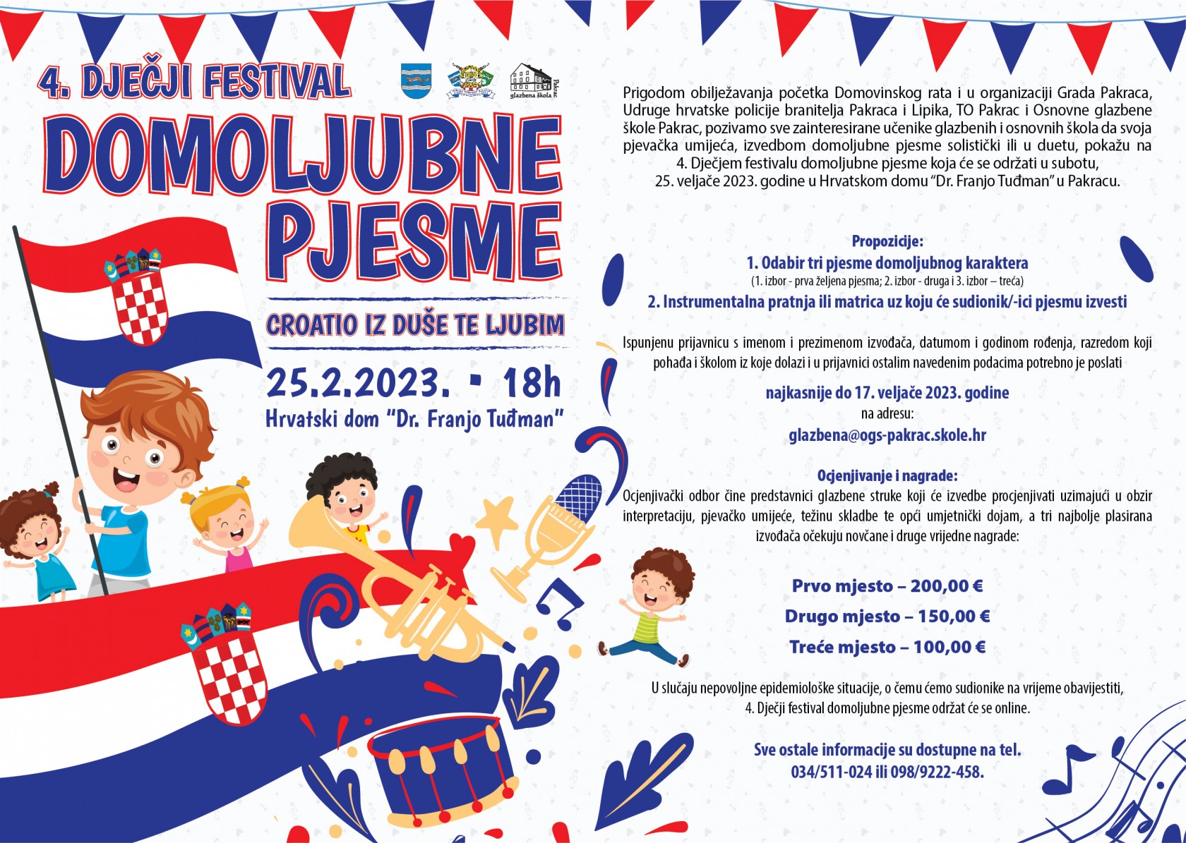 Uoči obilježavanja 32. obljetnice početka Domovinskog rata, u organizaciji Grada Pakraca, Udruge hrvatske policije branitelja Pakraca i Lipika i Osnovne glazbene škole Pakrac, pozivaju se svi zainteresirani učenici glazbenih i osnovnih škola da svoja pjevačka umijeća, solističkom izvedbom domoljubne pjesme, pokažu na 4. Dječjem festivalu domoljubne pjesme koji će se održati u subotu, 25. veljače 2023. godine u Hrvatskom domu „Dr. Franjo Tuđman“ u Pakracu.