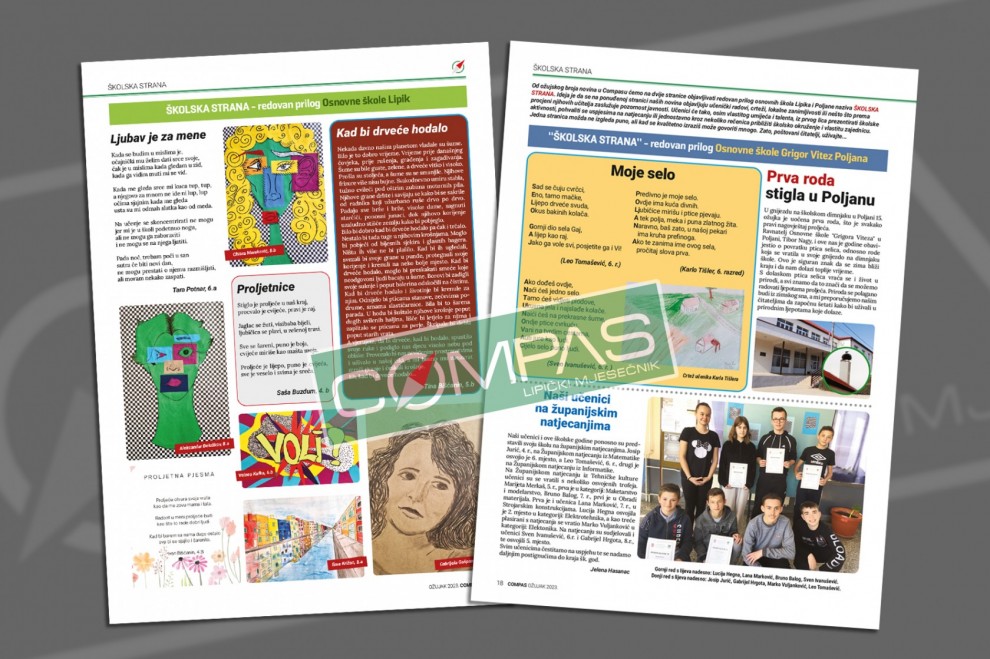 „Od ožujskog broja novina u Compasu ćemo na dvije stranice objavljivati redovan prilog osnovnih škola Lipika i Poljane naziva ŠKOLSKA STRANA. Ideja je da se na ponuđenoj stranici naših novina objavljuju učenički radovi, crteži, lokalne zanimljivosti ili nešto što prema procjeni njihovih učitelja zaslužuje pozornost javnosti. Učenici će tako, osim vlastitog umijeća i talenta, iz prvog lica prezentirati školske aktivnosti, pohvaliti se uspjesima na natjecanju ili jednostavno kroz nekoliko rečenica približiti školsko okruženje i vlastitu zajednicu. Jedna stranica možda ne izgleda puno, ali kad se kvalitetno izraziš može govoriti mnogo. Zato, poštovani čitatelji, uživajte…“, uvodni je tekst pojašnjenja ispred školskog sadržaja na 18. i 19. stranici najnovijeg 102. tiskanog izdanja Compasa koji se nalazi u prodaji od 30. ožujka.