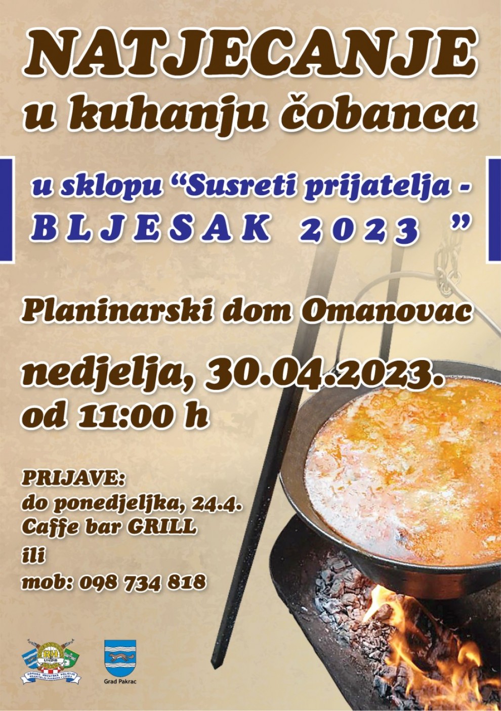 Jedan od najzanimljivijih dijelova ovogodišnjeg programa bit će natjecanje u kuhanju čobanca. Svi koji misle da imaju tajnu recepturu i vještinu u pripremi ovog tradicionalnog slavonskog jela mogu se prijaviti do 24. travnja (ponedjeljak) i pokazati svoje kulinarsko umijeće. Prijave se vrše u Caffe baru Grill ili pozivom na mobitel 098/734 818, dozanajmo od Miroslava Ivančića, predsjednika Udruge hrvatske policije.