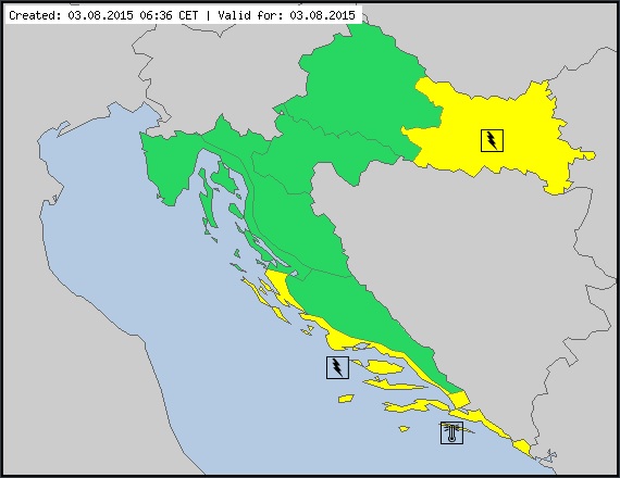 Prema prognozama Državnog hidrometeorološkog zavoda početak prvog radnog tjedna u kolovozu obilježit će promjenjivo vrijeme uz mjestimičnu kišu ili lokalne pljuskove s grmljavinom. "Djelomice sunčano uz promjenljivu naoblaku. Mjestimice kiša ili lokalni pljuskovi i grmljavina, osobito u Dalmaciji te Slavoniji i Baranji.", stoji u prognozi DHMZ za 3. kolovoza, dok je Meteoalarm DHMZ obojio većinu Hrvatske u zeleno osim regija Dubrovnik i Osijek. Za područje istočne Hrvatske gdje se nalazimo vrijedi "žuto upozorenje" zbog mogućih lokalnih pljuskova praćenih grmljavinskim nevremenom.