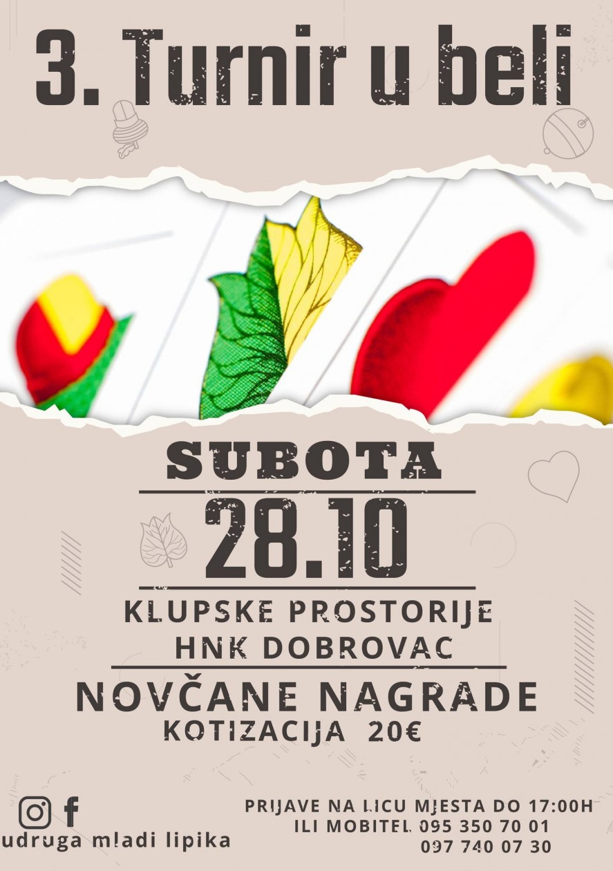 Nakon produžene ljetne stanke, Udruga Mladi Lipika s veseljem najavljuje povratak omiljenog turnira - turnira u beli! Matej Nemeth Campi, predsjednik ove vrijedne udruge mladih, ističe da su se dovoljno odmarali i da je došlo vrijeme za novo subotnje druženje.
