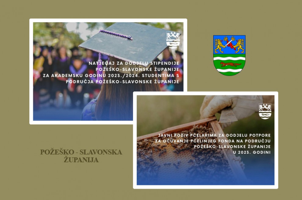 Raspisan je Natječaj za dodjelu stipendije Požeško-slavonske županije za akademsku godinu 2023./2024. studentima s područja Požeško-slavonske županije. Sredstvima koja su osigurana u proračunu stipendirat će se ukupno 20 studenata i to u tri kategorije, javljaju na mrežnim stranicama Županije.