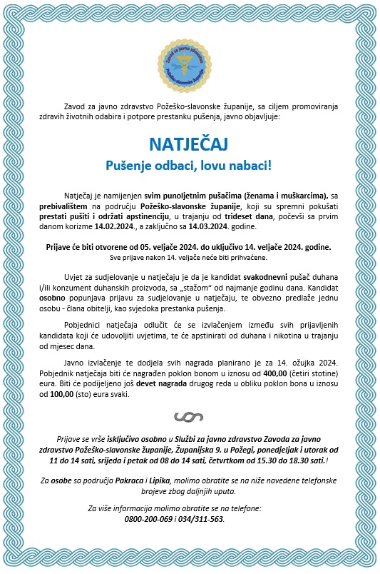 Zavod za javno zdravstvo Požeško-slavonske županije tradicionalno, već desetu godinu za redom, raspisuje Natječaj "Pušenje odbaci, lovu nabaci" namijenjen svim punoljetnim pušačima oba spola s više od godine dana pušačkog „staža“, a koji žele dugoročno pokušati prestati pušiti potaknuti korizmom.
