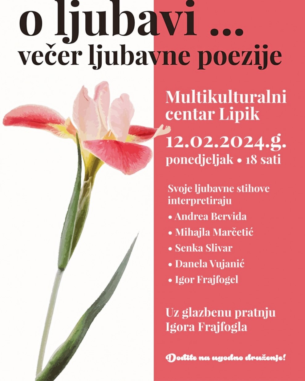 Večer ljubavne poezije održat će se u ponedjeljak, 12. veljače, s početkom u 18 sati u Multikulturalnom centru Lipik. Na događaju će svoje ljubavne stihove interpretirati Andrea Bervida, Mihajla Marčetić, Senka Slivar, Danela Vujanić te Igor Frajfogel.