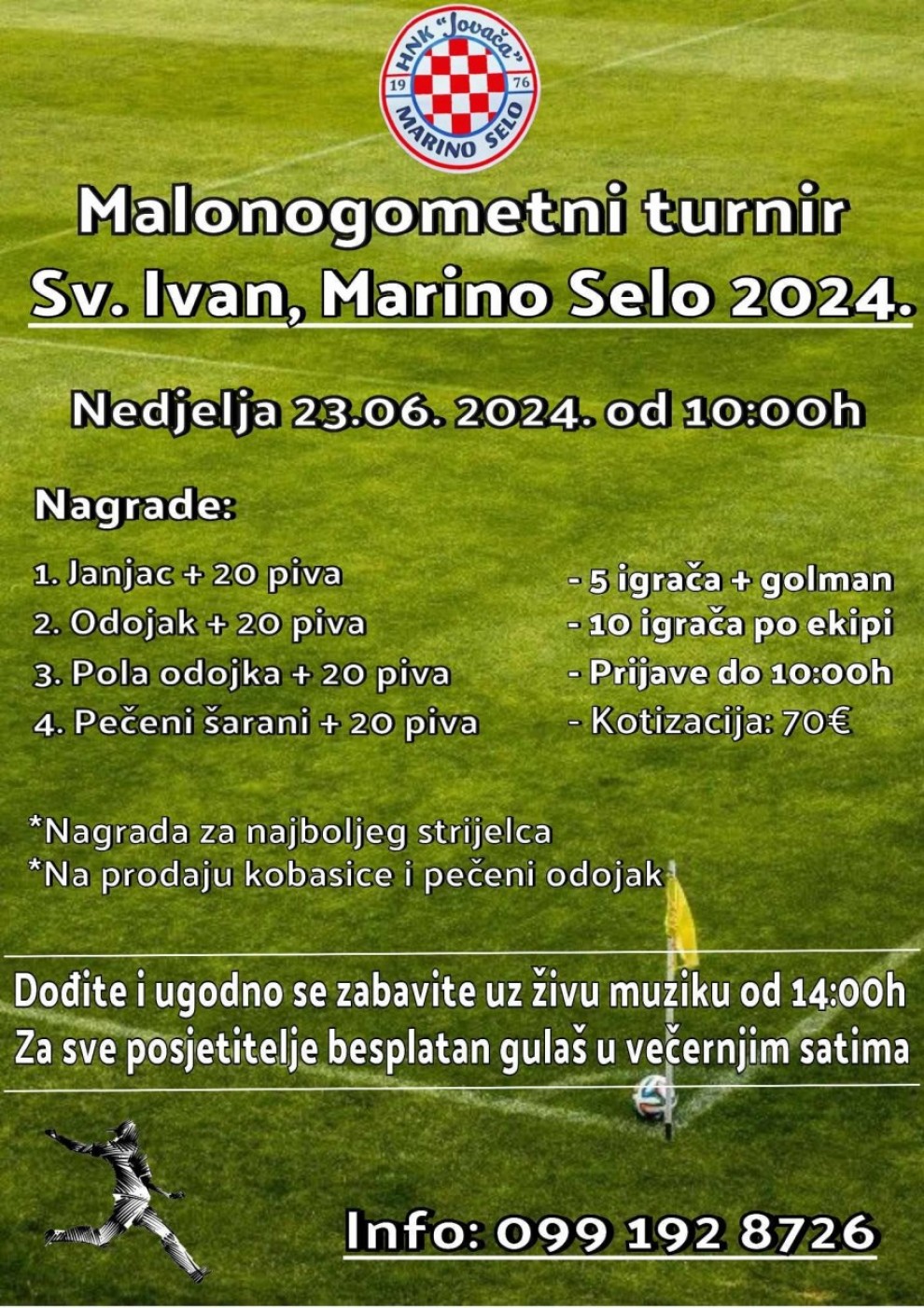 Pod okriljem HNK "Jovača" iz Marinog Sela, bit će održan tradicionalni malonogometni turnir Sv. Ivan. Datum održavanja je nedjelja, 23. lipnja ove godine, a početak je u 10:00 sati.