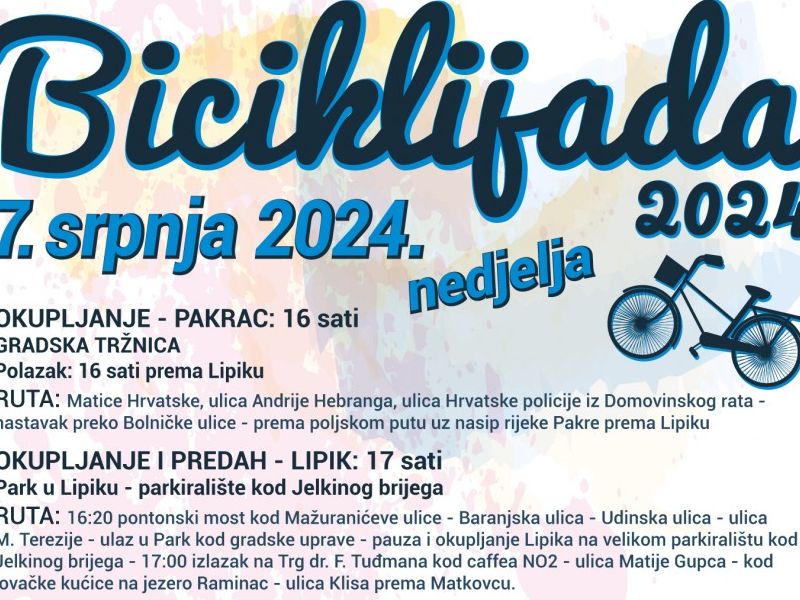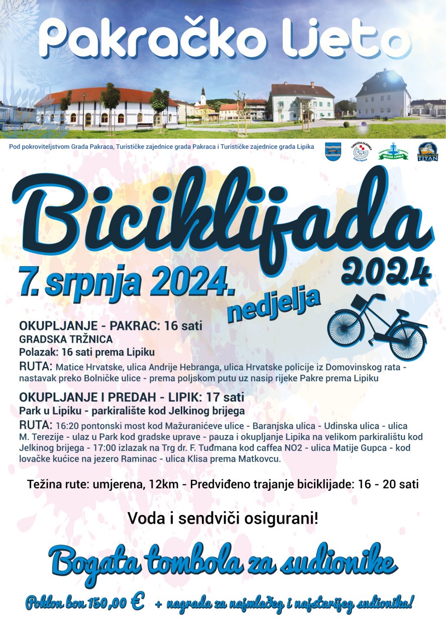 U nedjelju, 7. srpnja, ljubitelji biciklizma ponovno će imati priliku sudjelovati u tradicionalnoj, 23. po redu biciklijadi na prostoru Lipika i Pakraca. Ova biciklijada, koju organiziraju turističke zajednice oba grada, jedna je od omiljenih ljetnih aktivnosti koja svake godine privlači sve veći broj sudionika – od ozbiljnih biciklista do rekreativaca, te obitelji s djecom.