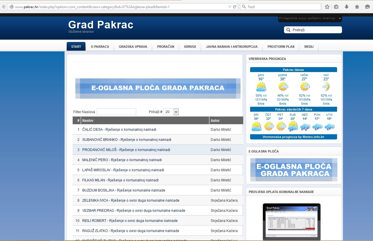 Građani na koje su naslovljena rješenja objavljena na e-oglasnoj ploči, mogu se obratiti u pakračku gradsku upravu radi preuzimanja istih. Sva rješenja koja nisu preuzeta osobno od naslovljenih građana, temeljem Zakona se smatraju uručena osmim danom od dana objave na e-oglasnoj ploči, napisano je u obavijesti na službenoj stranici Grada Pakraca o uvođenju novog uslužnog internet servisa. Podsjećamo, kako su već ranije na službenoj stranici Grada Pakraca pustili u rad servis Provjera uplate komunalne naknade, preko kojeg građani uz prethodnu registraciju i prijavu mogu pratiti svoje uplate ili dugovanja za komunalnu naknadu.