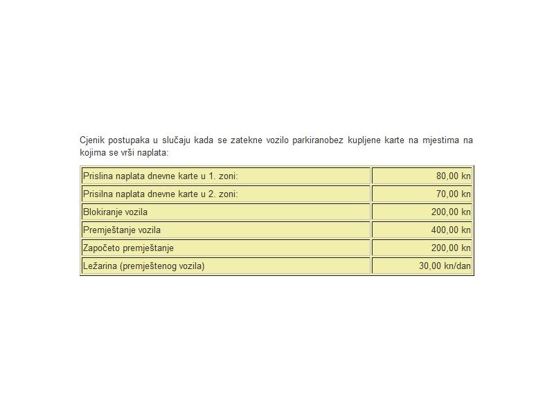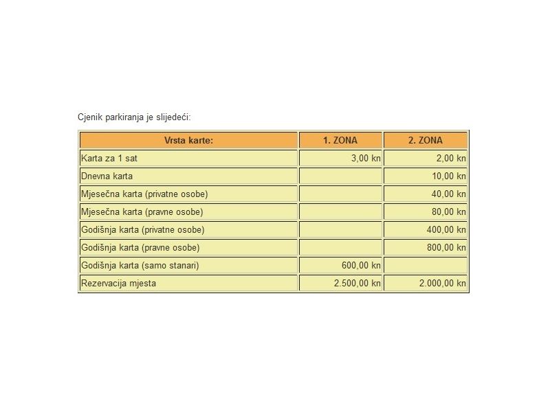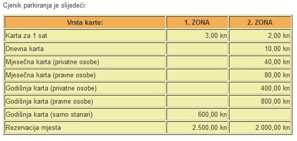S ovom odlukom također su parkirne površine pod naplatom podijeljene u dvije zone. Prvu zonu čine parkirna mjesta u ulicama: Gojka Šuška, Hrvatskih velikana, Trg bana Josipa Jelačića od kućnog broj 1 do kućnog broja 18, Braće Radića, Bolnička od Trga dr. Franje Tuđmana do kućnog broja 47, te Trg 76. bataljuna. Drugu zonu čine parkirna mjesta u ulicama: 30. svibnja, Kralja Tomislava, te Trg dr. Ivana Šretera.