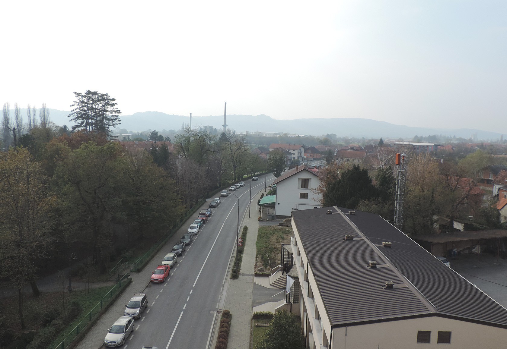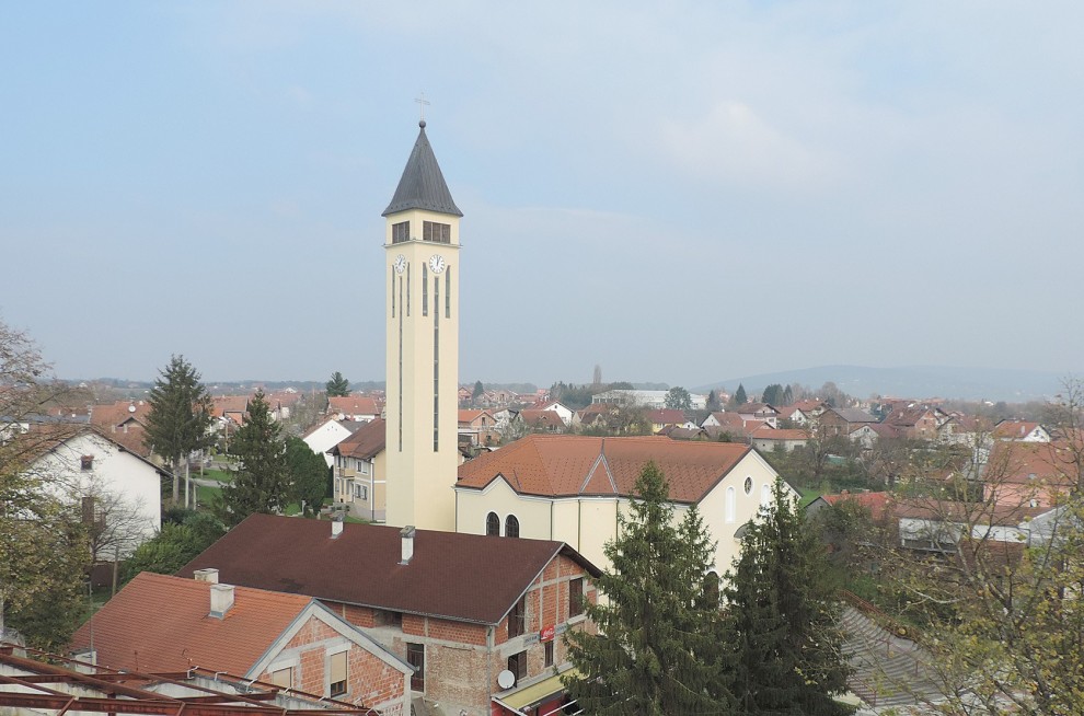 Pogled na središte Lipika, Trg dr. Franje Tuđmana, crkva sv. Franje Asiškog i Toplice Lipik, s 25 metara visine. S jedne strane u daljini se nazire tvornički dimnjak staklane i silosi u Dobrovcu, a s druge strane, obronci Psunja i brdo Omanovac.