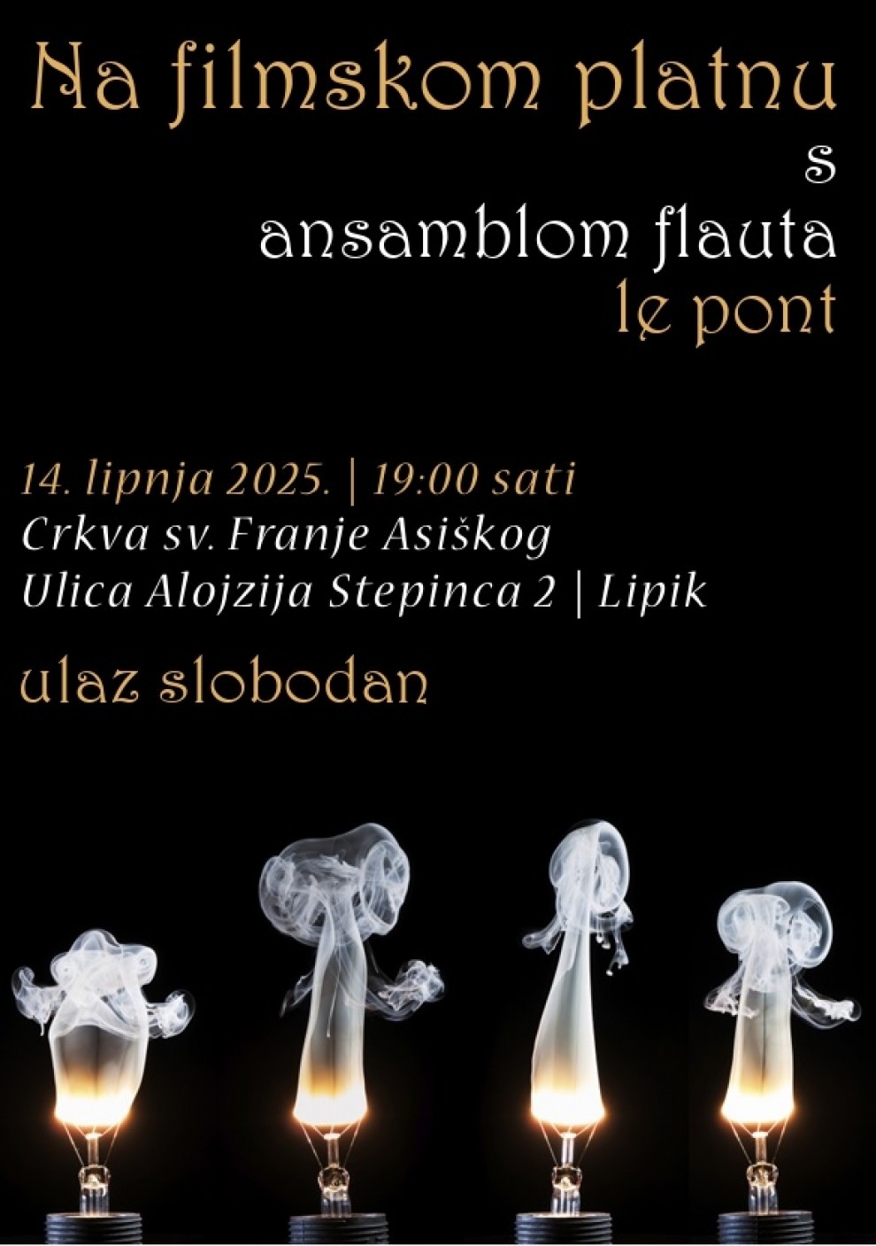 Ulaz na koncert je slobodan, a sve ljubitelje glazbe i filma vlč. Roko Ivanović poziva da dožive večer ispunjenu zvukovima koji će evocirati emocije, uspomene i vizije s velikog platna.