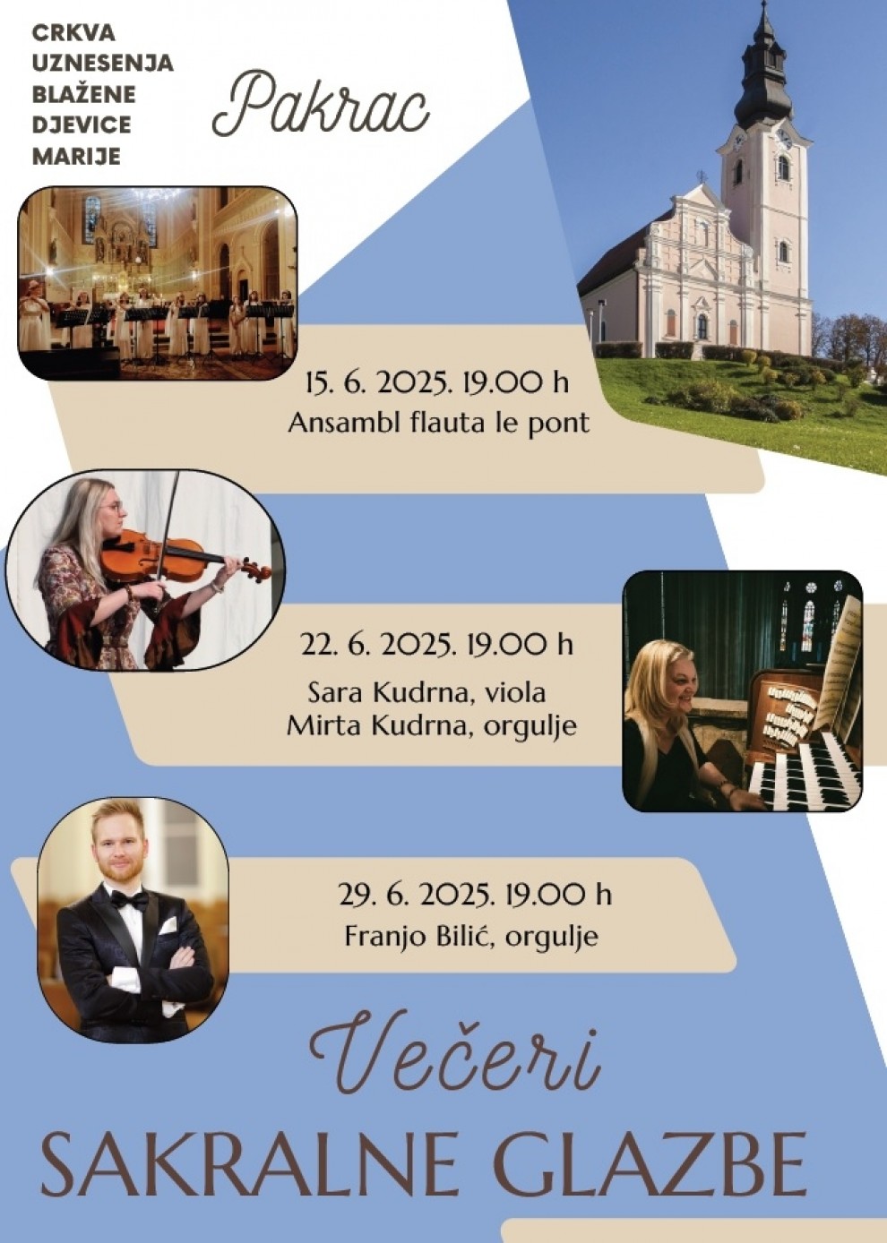 Svi koncerti počinju u 19:00 sati, a ulaz je slobodan. Pakrački župnik, vlč. Jozo Zorić, poziva građane Pakraca i Lipika, kao i širu publiku iz okolnih mjesta, da iskoriste ovu priliku za doživljaj glazbe u sakralnom prostoru koji prirodno nadopunjuje poruku i emociju izvedbi.
