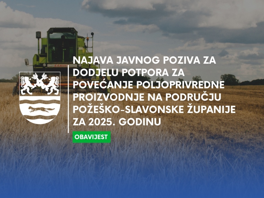 Požeško-slavonska županija najavljuje otvaranje Javnog poziva za dodjelu potpora male vrijednosti za povećanje poljoprivredne proizvodnje na području županije za 2025. godinu.