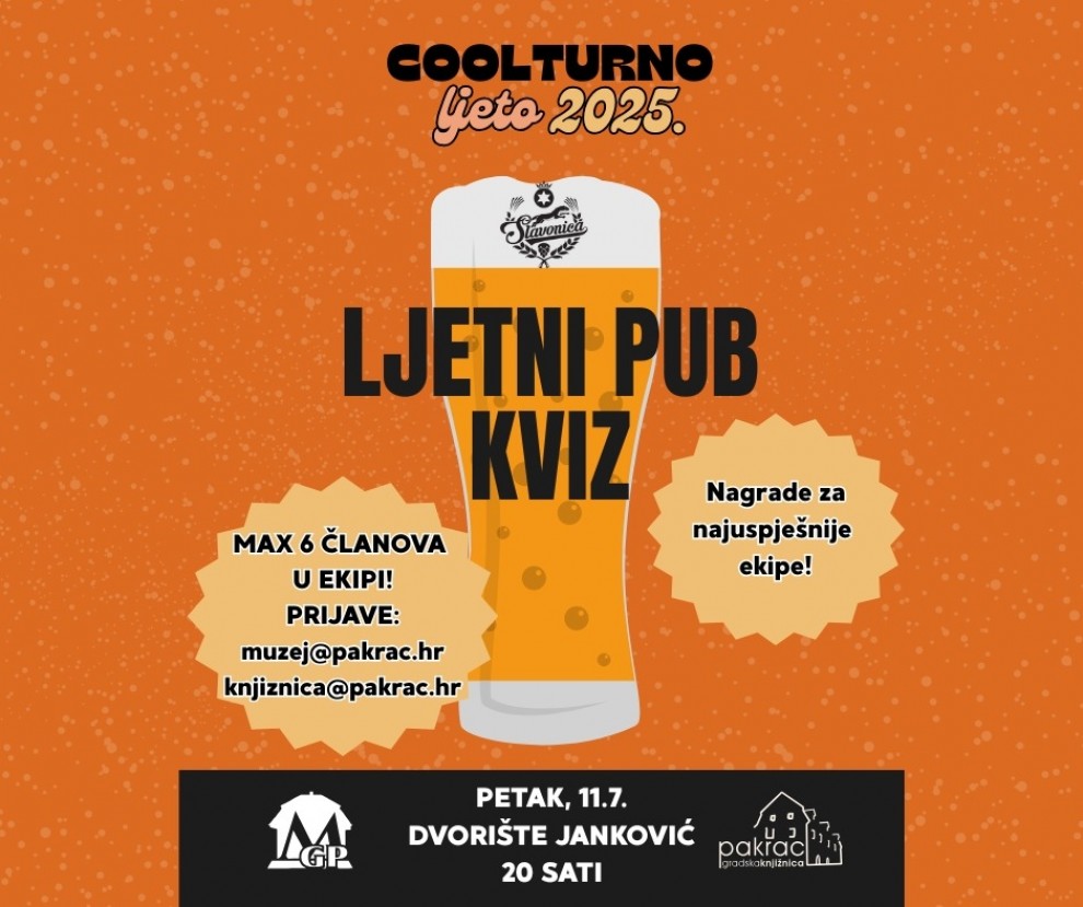 Gradska knjižnica Pakrac i Muzej grada Pakraca i ove godine zajednički organiziraju Ljetni pub kviz, popularno natjecanje u znanju koje će se održati u petak, 11. srpnja, na otvorenom u Dvorištu Janković.