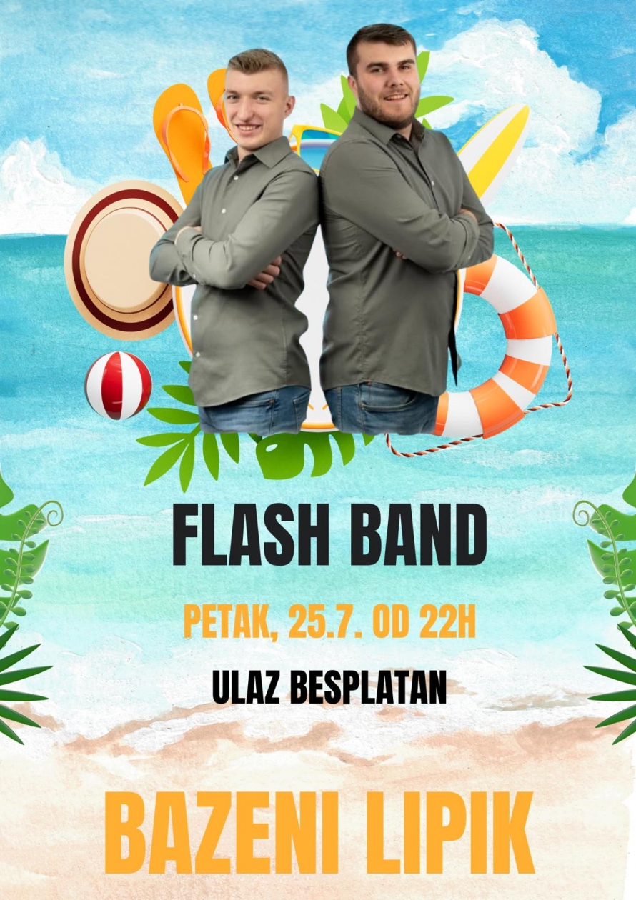 U petak, 25. srpnja, s početkom u 22 sata, na pozornicu Bazena Lipik stiže Flash Band, popularni mladi glazbeni duo poznat po izvođenju domaćih hitova i opuštenom nastupu koji lako osvoji publiku. Redovito nastupaju na različitim manifestacijama, a njihova svirka uvijek jamči dobru zabavu i ugodno druženje.