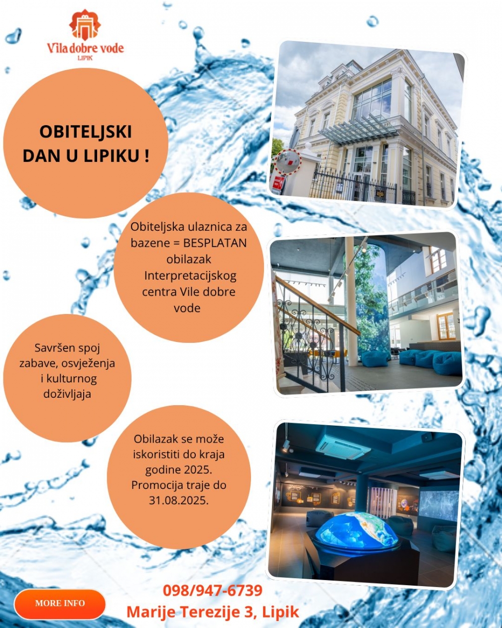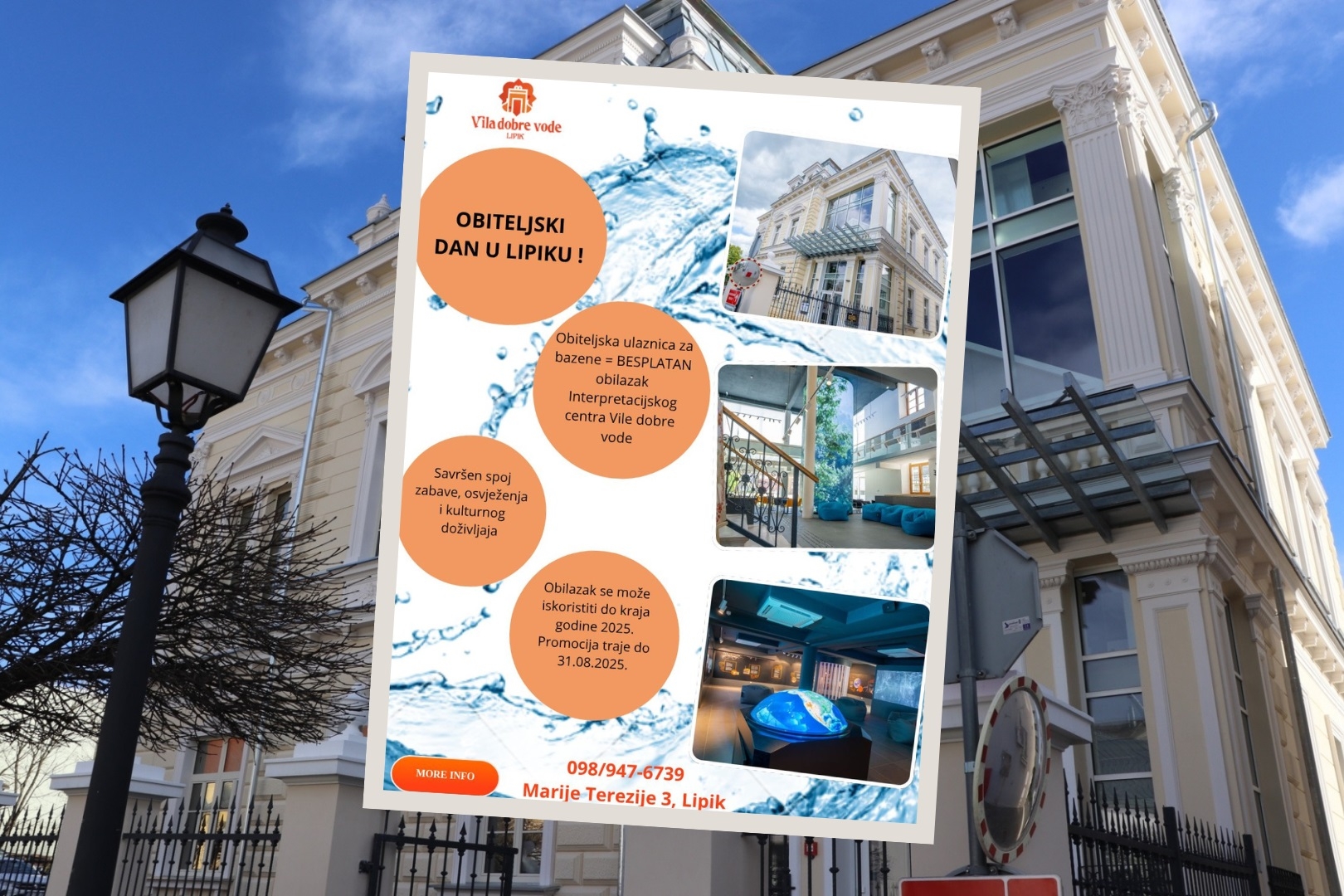 Do kraja kupališne sezone svi posjetitelji Bazena Lipik koji kupe obiteljsku ulaznicu ostvaruju pravo na besplatan obilazak Interpretacijskog centra termalne baštine „Vila dobre vode“.