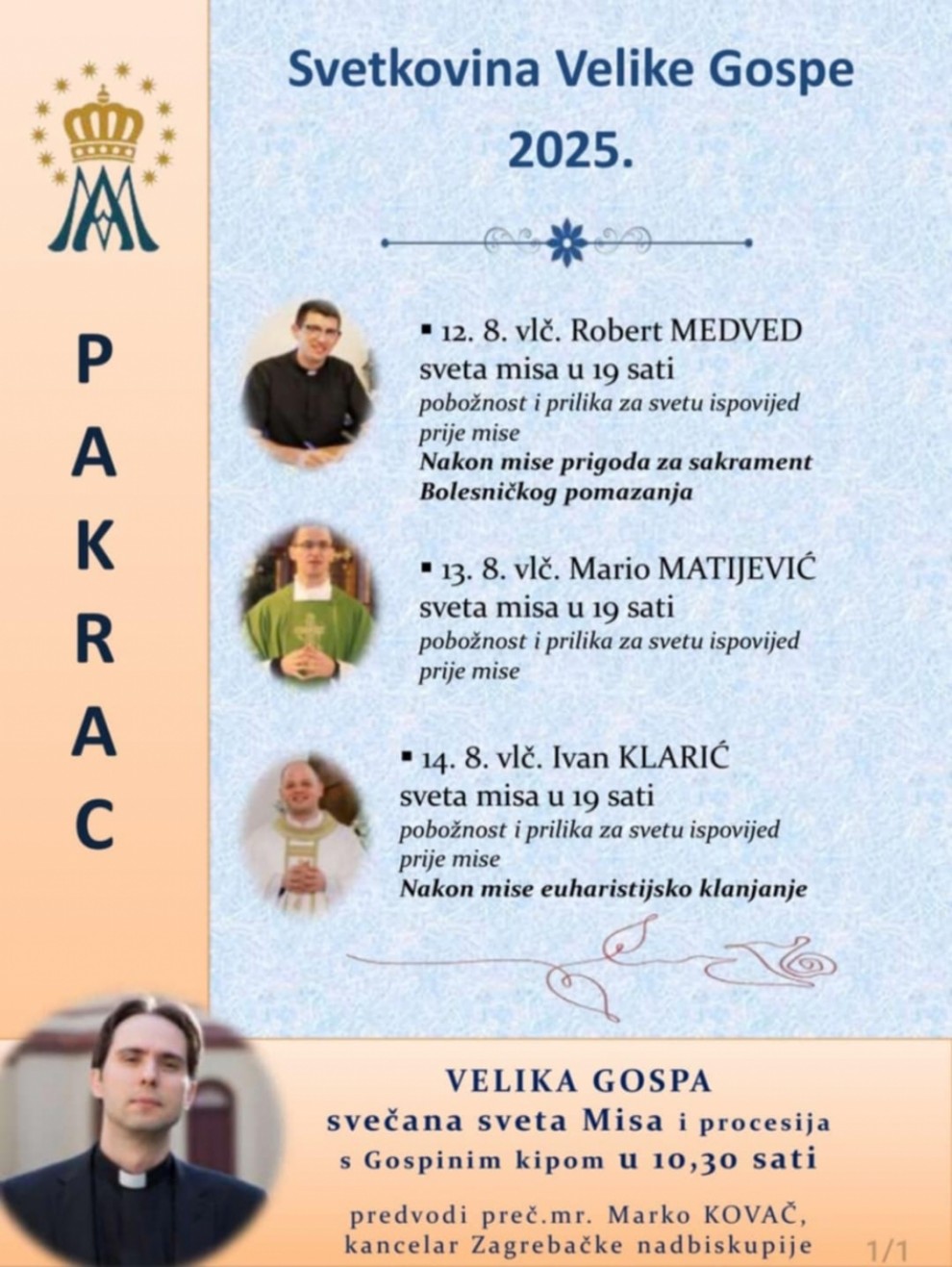 Tijekom tih dana, vjernici Pakraca i okolice moći će se duhovno obogatiti, sudjelovati u sakramentima, te proslaviti Veliku Gospu u zajedništvu s Crkvom i zajednicom.