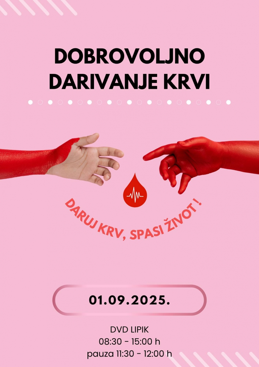 Gradsko društvo Crvenog križa Pakrac u suradnji s Hrvatskim zavodom za transfuzijsku medicinu poziva sve dobrovoljne darivatelje krvi, kao i one koji to tek žele postati, da se odazovu akciji darivanja krvi koja će se održati u ponedjeljak, 1. rujna 2025. godine u prostorijama DVD-a Lipik, Slavonska ulica 49. Krv će se moći darivati u vremenu od 8:30 do 15:00 sati, uz pauzu od 11:30 do 12:00 sati.