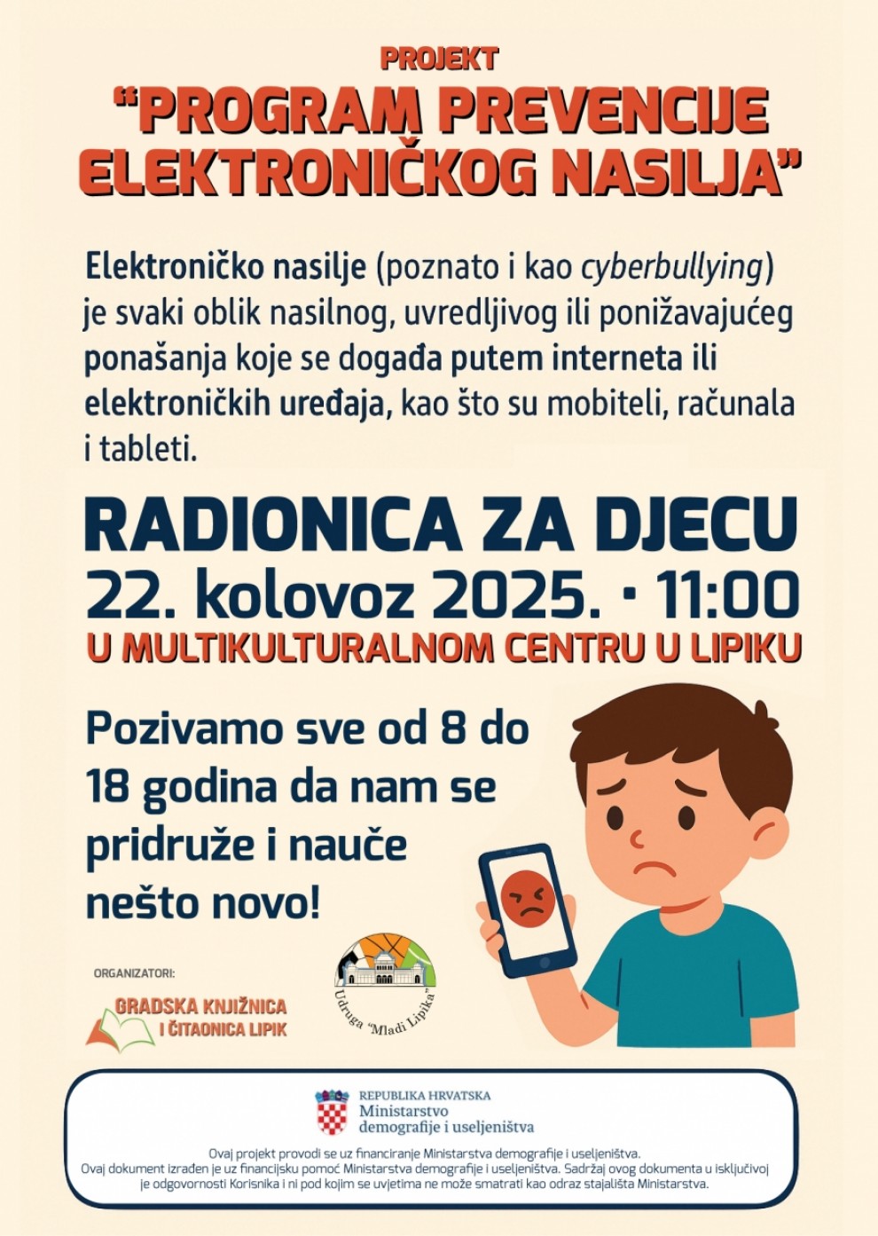 U sklopu projekta „Program prevencije elektroničkog nasilja“, Udruga Mladi Lipika, u suradnji s Gradskom knjižnicom i čitaonicom Lipik u petak, 22. kolovoza organizira edukaciju o jednoj od najvažnijih tema suvremenog društva – elektroničkom nasilju, poznatijem i kao cyberbullying. Radionica za djecu vezana na ovu temu održat će se u Multikulturnom centru s početkom u 11 sati.