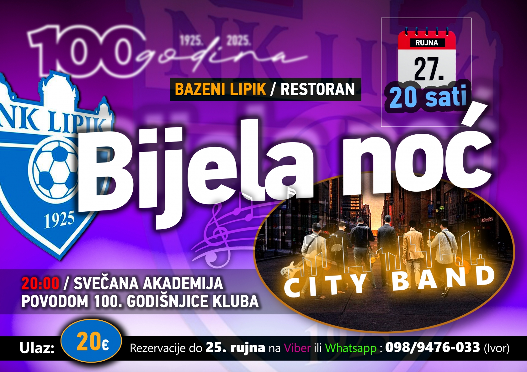 Sadržaj cjelovečernjeg programa bit će otvoren svečanom akademijom posvećenom osvrtu na bogatu povijest kluba, ali i prisjećanjem na sve naraštaje igrača, trenera i entuzijasta koje su ga stvarale i održavale kroz stoljeće postojanja. Nakon svečanog dijela, u nastavku večeri će u prostoru restorana biti upriličena klupska Bijela noć – zabavna večer uz živu svirku City Banda iz Nove Gradiške.