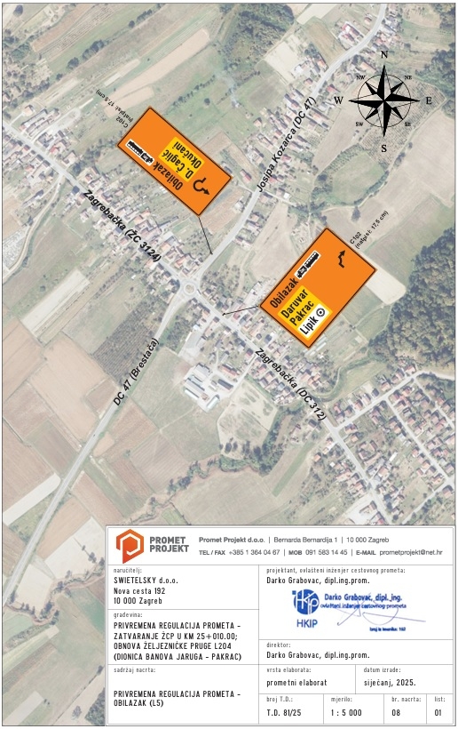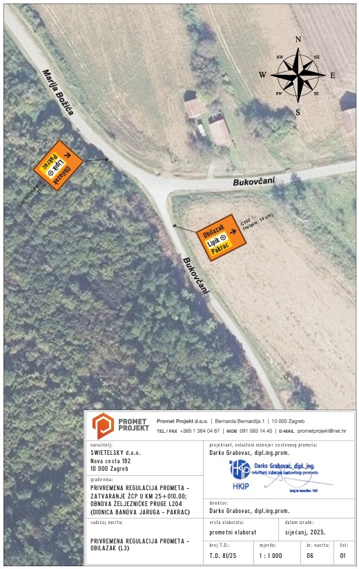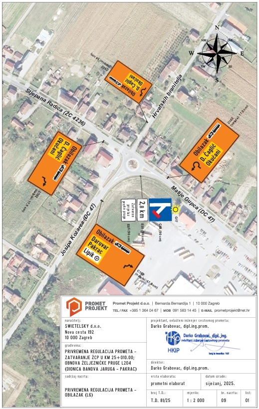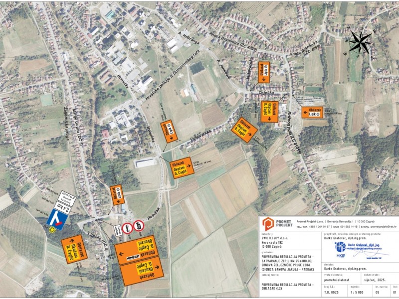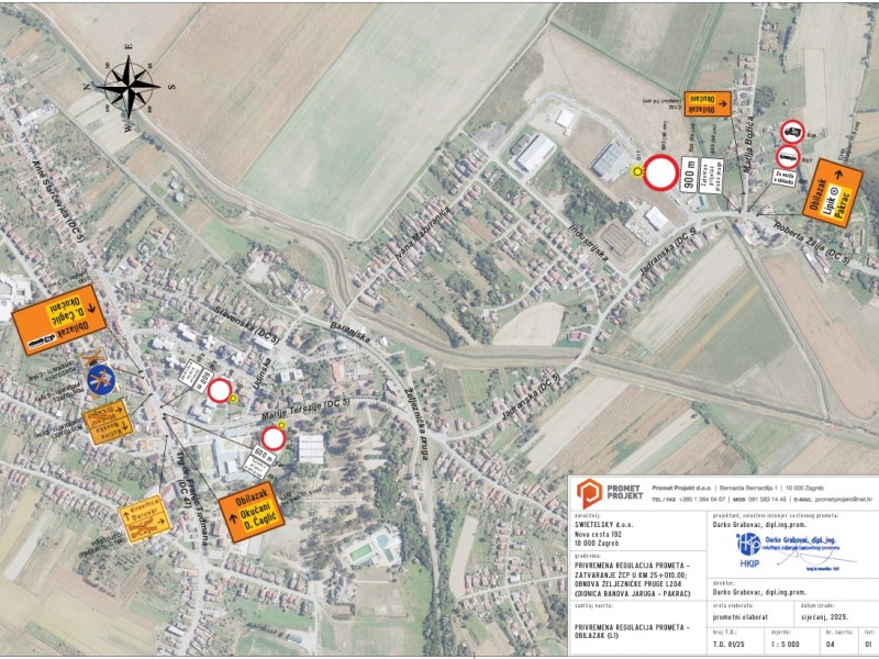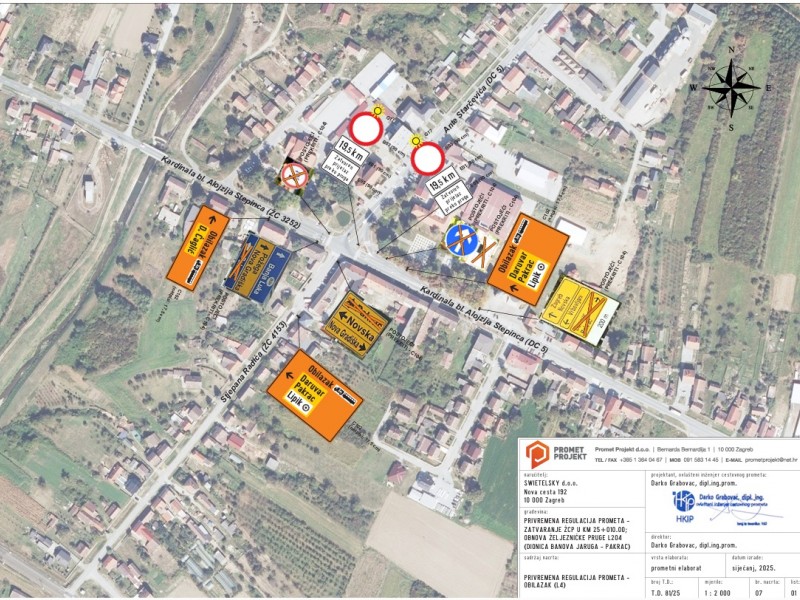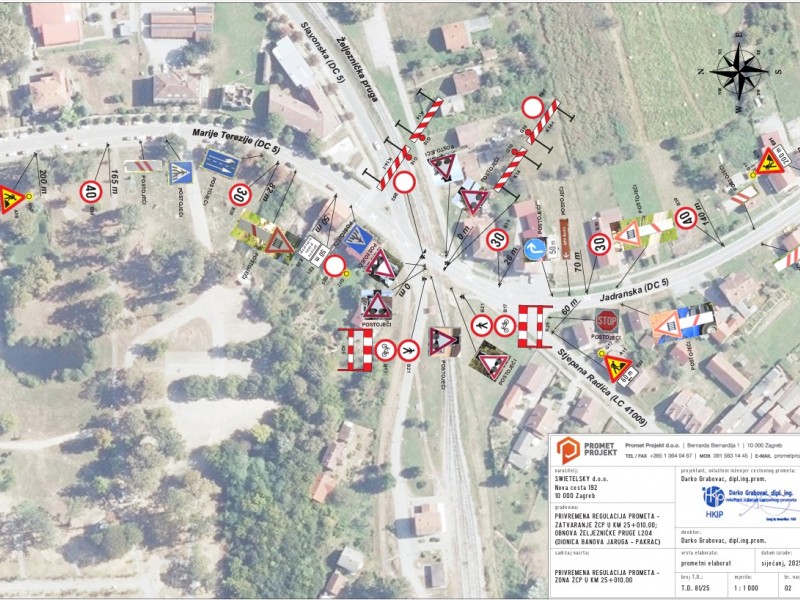 Tijekom izvođenja radova promet preko prijelaza u kilometru 25+010.00 bit će u potpunosti onemogućen, a vozila će se preusmjeravati na obilazne pravce.