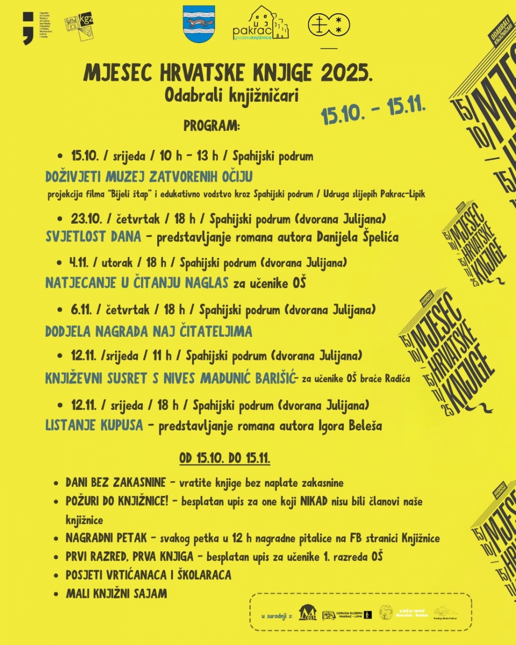Tradicionalno, manifestaciji se pridružila i Gradska knjižnica Pakrac, koja je pripremila bogat program događanja u sklopu Mjeseca hrvatske knjige. Program uključuje raznovrsne aktivnosti za sve uzraste – od najmlađih do odraslih – s posebnim naglaskom na čitanje i pričanje priča. Čitatelji će tako imati priliku sudjelovati u radionicama pripovijedanja, susretima s autorima te slušati tradicionalne hrvatske bajke i legende, čime se potiče mašta, razvija ljubav prema čitanju i jača kulturni identitet zajednice.
