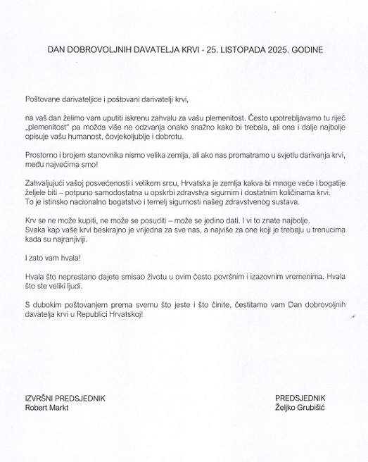 Povodom Dana darivatelja krvi, čestitku dobrovoljnim davateljima su uputili i Robert Markt, izvršni predsjednik te Željko Grubišić, predsjednik HCK.