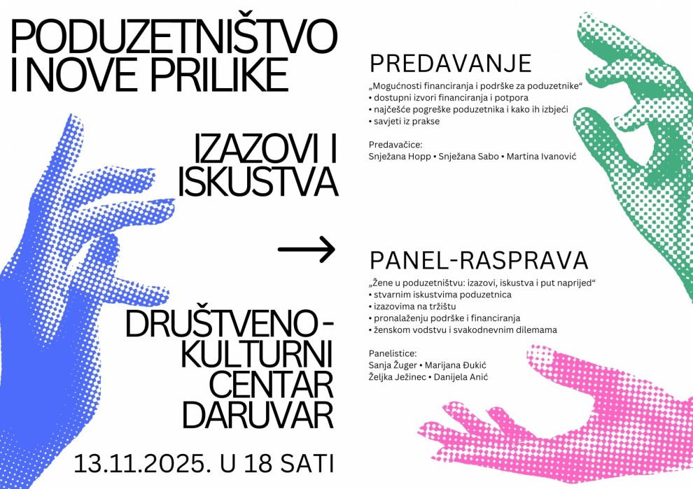 U Društveno-kulturnom centru Daruvar 13. studenoga 2025. godine s početkom u 18:00 sati održat će se događaj pod nazivom „Poduzetništvo i nove prilike – izazovi i iskustva“, namijenjen obrtnicima i malim poduzetnicima koji žele unaprijediti svoje poslovanje i saznati više o aktualnim mogućnostima financiranja i poticaja.
