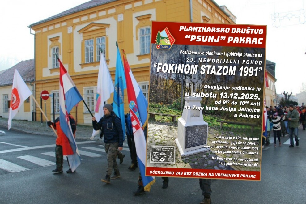 Planinarsko društvo Psunj Pakrac najavilo je održavanje tradicionalnog 29. memorijalnog planinarskog pohoda „Fokinom stazom 1991.“ u subotu, 13. prosinca ove godine. Riječ je o događaju s dugom tradicijom koji se svake godine organizira u čast poginulim hrvatskim braniteljima Marijanu Kulhaviju - Foki, Ivanu Bedekoviću, Anti Ćuriću, Franji Gašparu, Draženu Hudecu, Željku Novoselu i Darku Perošu.