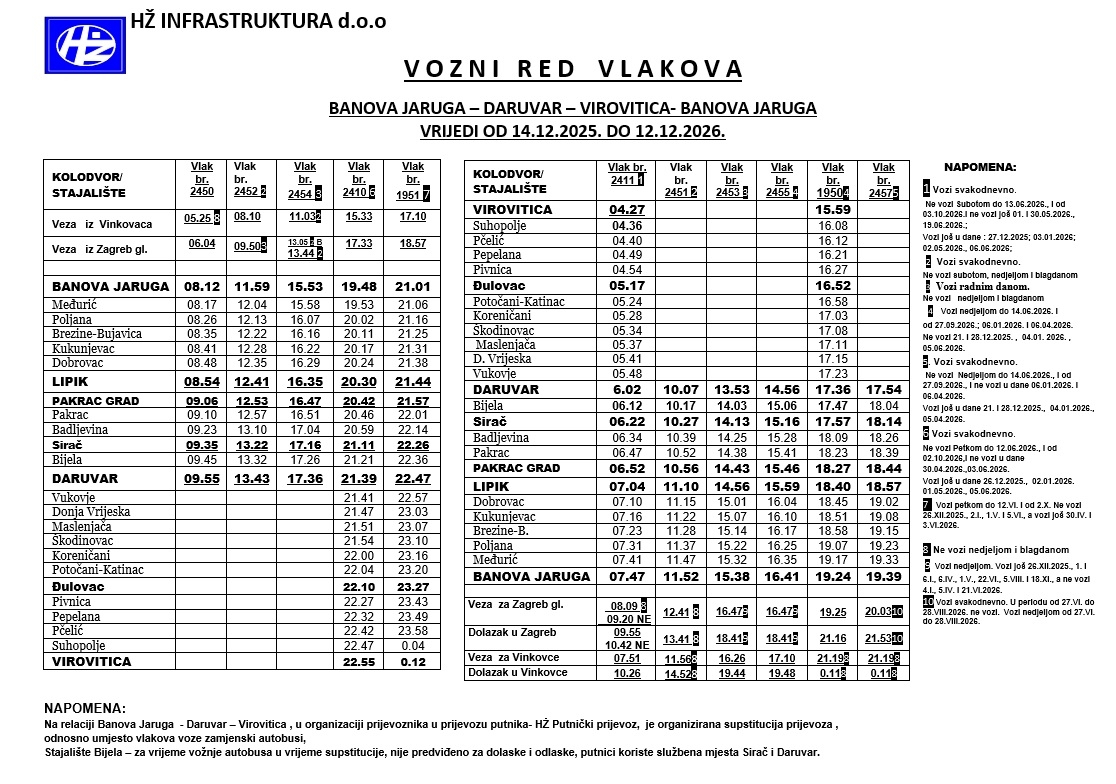Hrvatske željeznice objavile su novi vozni red za relaciju Banova Jaruga – Lipik – Pakrac – Daruvar – Virovitica te u povratnom smjeru Virovitica – Daruvar – Pakrac – Lipik – Banova Jaruga. Vozni red stupa na snagu 14. prosinca ove godine i vrijedit će do 12. prosinca iduće godine.
